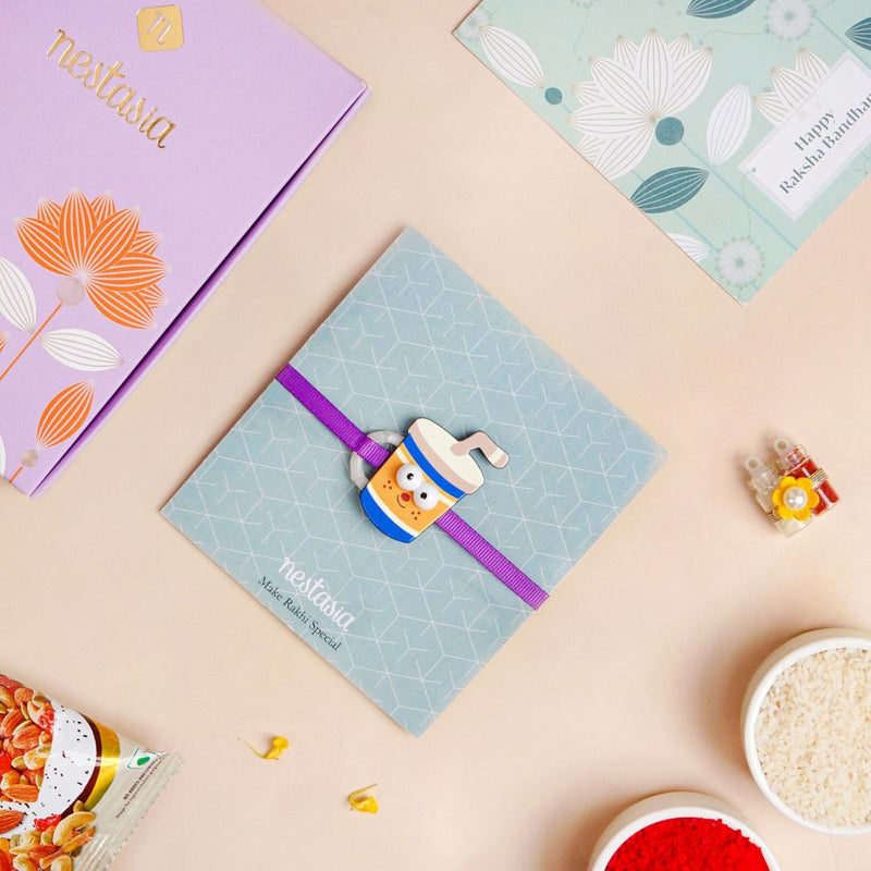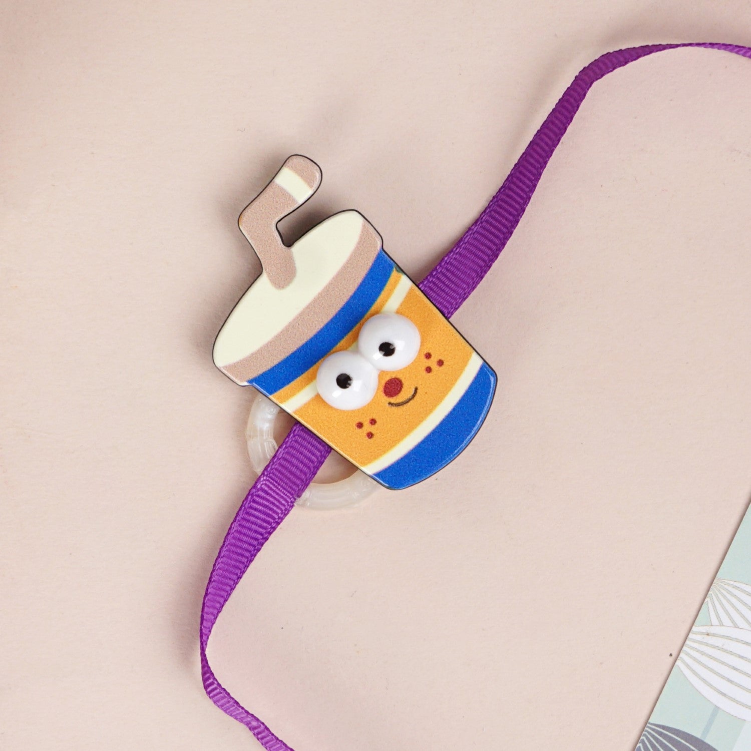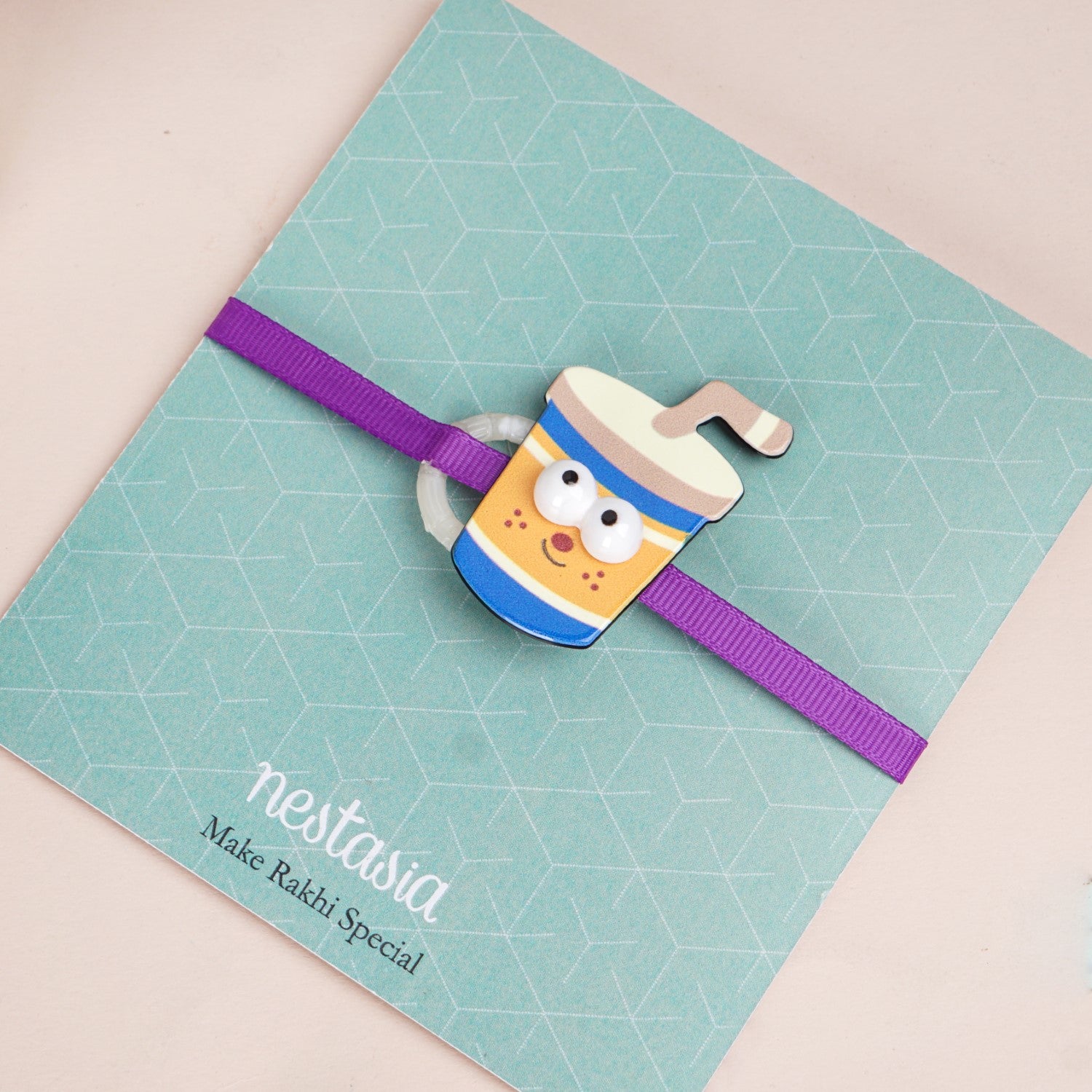 This googly eyed sipper mug Rakhi, is perfect for your brothers who have the prettiest of eyes or love their sipper too much. It has a purple ribbon attached to a cylindrical-shaped PVC imitating the style of a cartoon sipper mug with a straw. The set includes 1 Rakhi, 1 roli chawal bottle set,1 pack of mixed dry fruits (free gift),1 gift box, and 1 wish card.