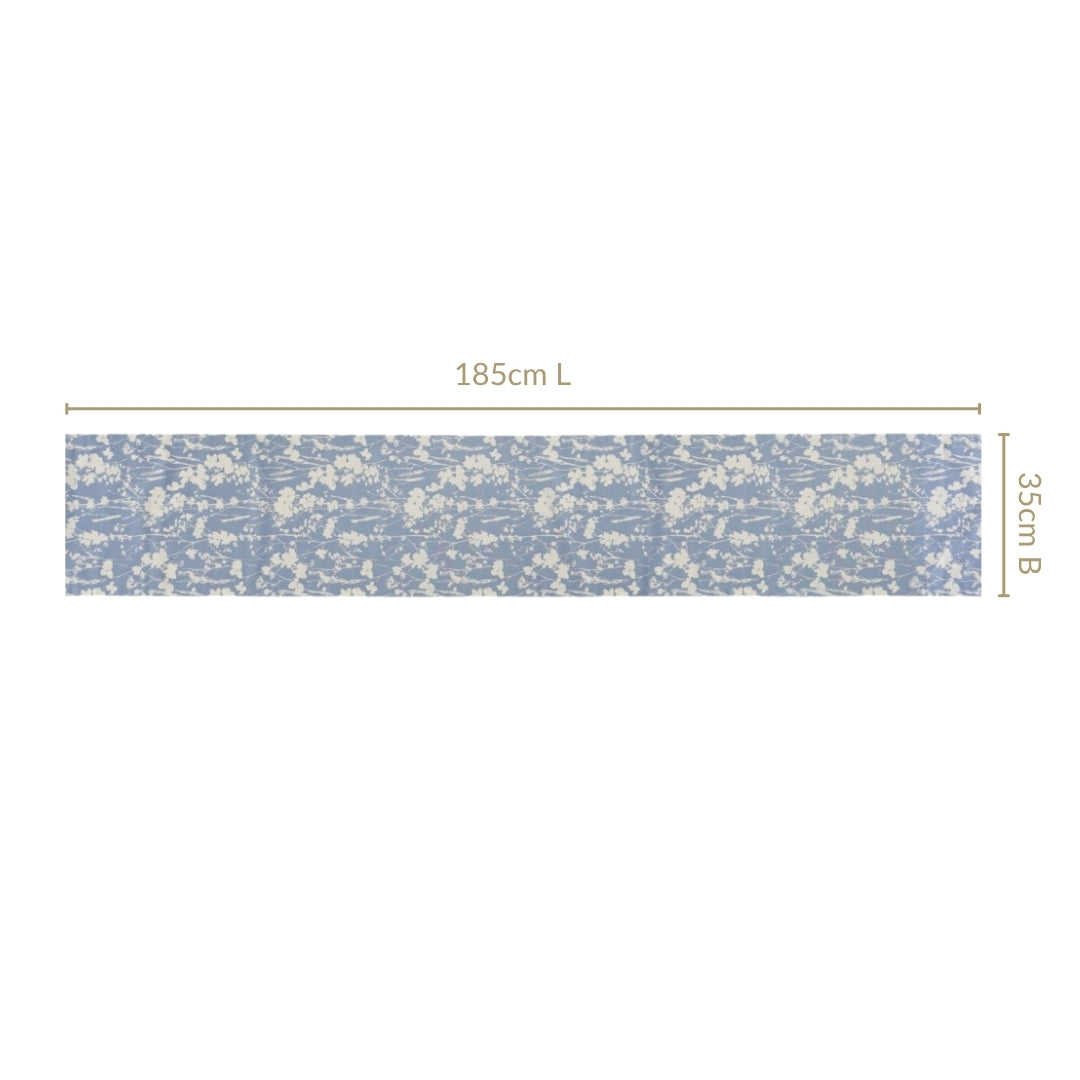 Design: Elevate your tablescape with this elegantly understated slate blue table runner, designed to bring contemporary charm to your dining experience. Measuring 185x35cm, it offers perfect proportions for six-seater tables, creating a stylish focal point without overwhelming your tableware. The rich slate blue hue provides a versatile foundation that complements both modern and traditional decor styles. The design features a sophisticated slate blue base with a white floral design that brings a calm, contemporary elegance to your dining space.