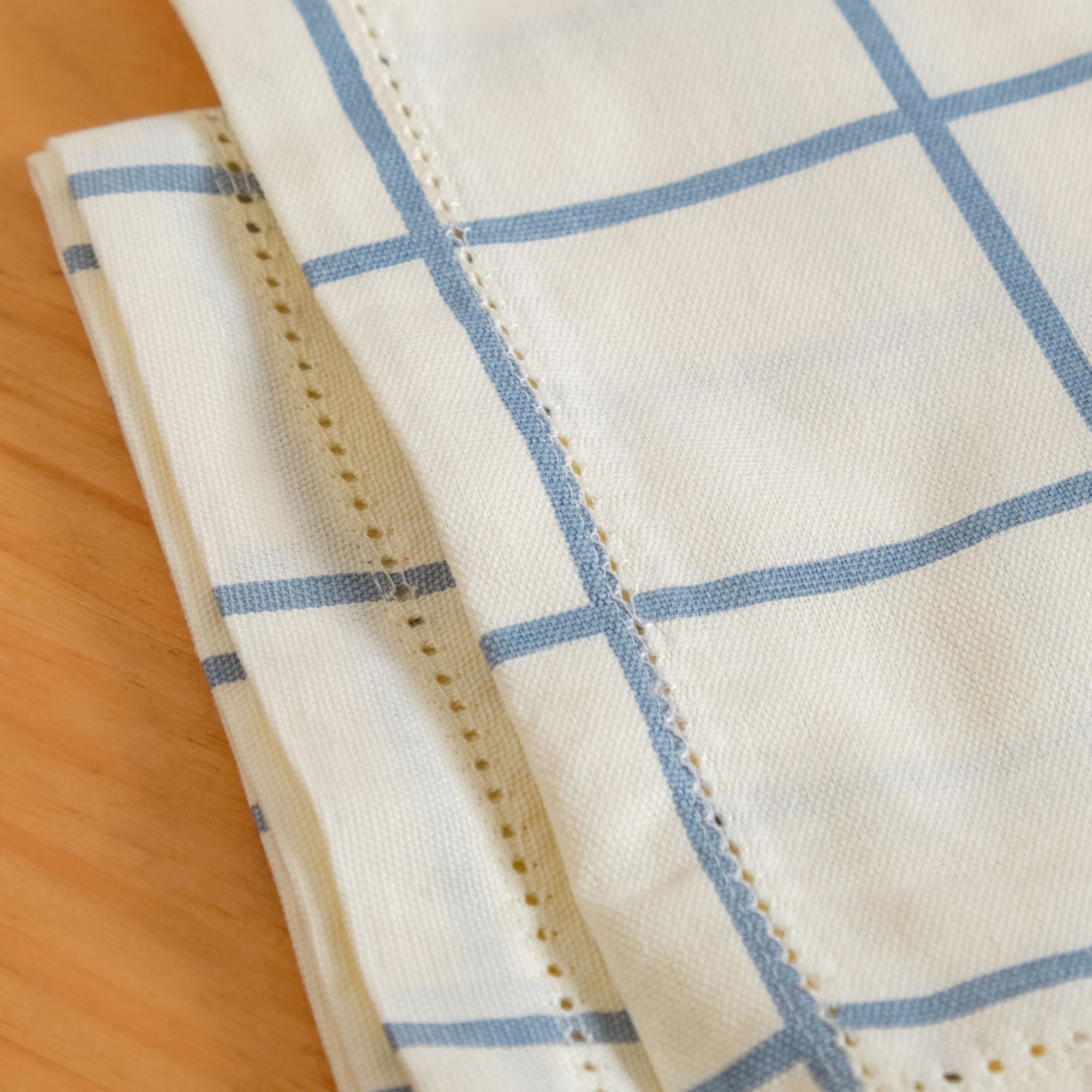 Design: This table napkin set boasts a chic, contemporary aesthetic. Each napkin is made with premium cotton and features an elegant windowpane grid design in a calming slate blue colour. The subtle acrylic polymer layer enhances the fabric's durability and gives it a soft, yet sturdy feel. They are finished with sturdy edges for daily use, perfect for completing your table linen set.