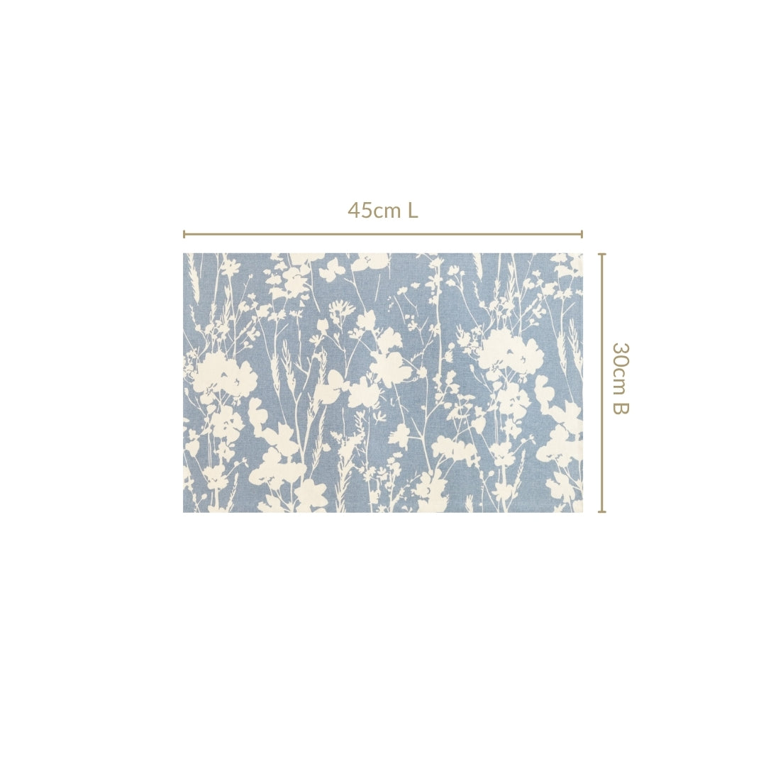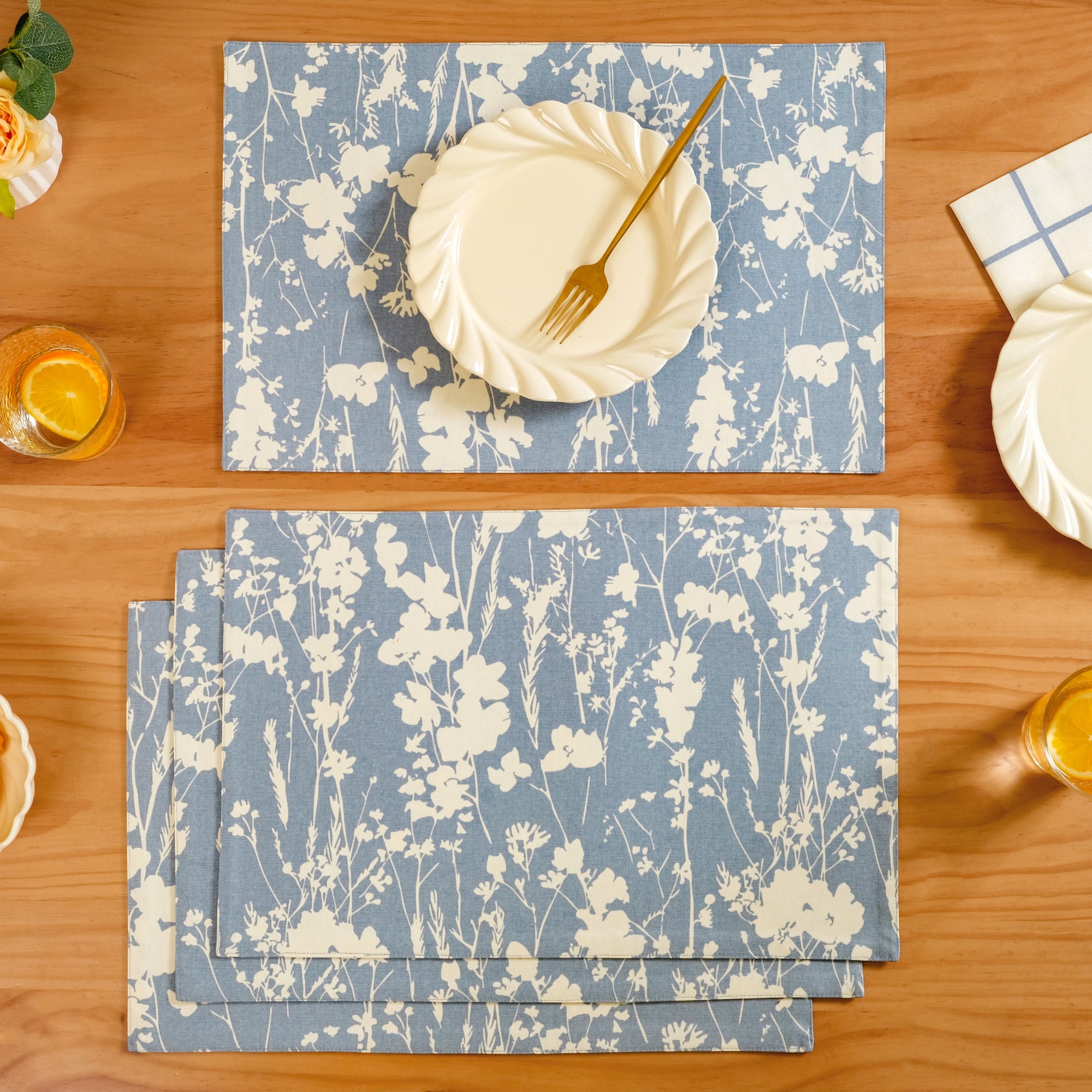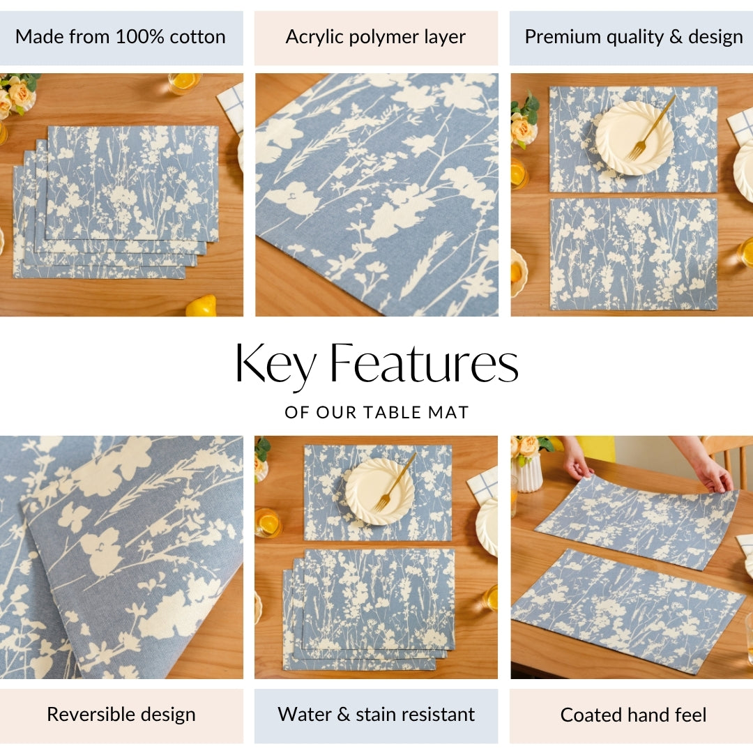 Design: Each placemat showcases a rich slate blue background adorned with delicate white floral patterns, creating a harmonious balance of modern colour and classic charm. Perfect for dinner parties and family meals alike, the complete set ensures every guest enjoys both style and functionality. The design features a light slate-blue base complemented by intricate white floral motifs. This elegant botanical patterning creates a beautiful contrast that adds organic sophistication to your table, while the versatile colour scheme ensures they coordinate seamlessly with various dinnerware styles and table settings for any occasion.