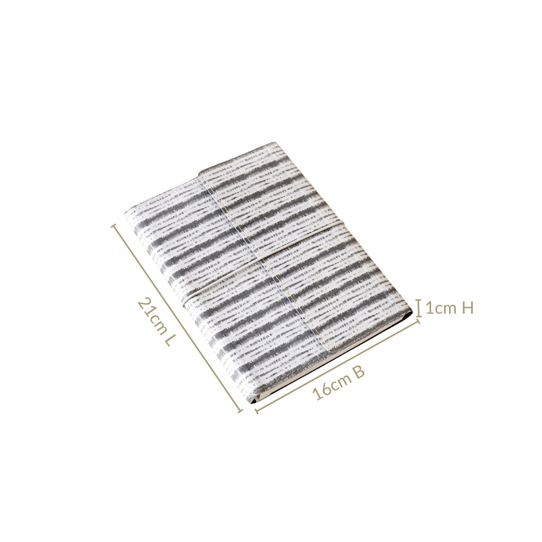 Design: The diary stands out with its refined minimalism and textured visual appeal. The cover features a coordinated pattern of horizontal slate grey lines over a white base, reminiscent of hand-drawn strokes, giving it an artistic vibe. The pattern flows continuously across both sides of the notebook, with a sturdy elastic band holding it securely shut. The hardbound cover provides durability, while the soft-touch finish adds elegance. Designed with simplicity in mind, this notebook blends seamlessly into both professional and personal settings.