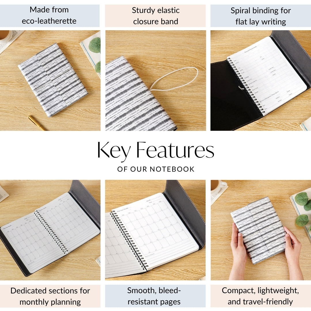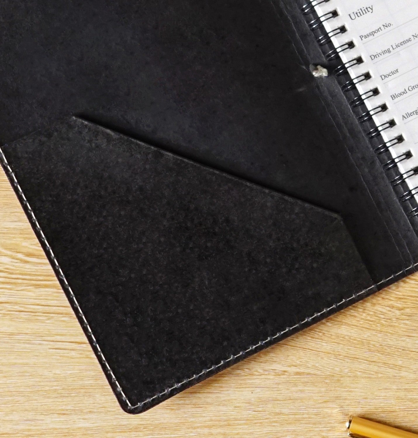 Benefits: Its sturdy construction, understated design, and practical size make the notebook ideal for everyday use, whether in meetings, on the go, or during solo journaling sessions. The elastic closure keeps your pages protected, and the smooth paper ensures an effortless writing experience. The spiral binding allows you to turn the pages smoothly and keeps them flat for a comfortable writing experience, while the flap-style pocket offers convenient storage for notes and receipts. This notebook is suited for students and professionals alike. It also makes a thoughtful and stylish gift.