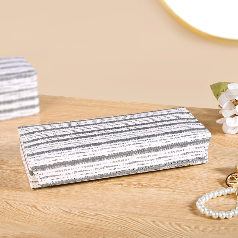 Design: Crafted with a sturdy leatherette base and topped with a textured canvas lid, this long organising box is both lightweight and durable. Inside, a soft grey suede-like lining gently cushions your jewellery, giving it a protective and luxurious home. The lid features a classic tweed-style print in subtle grey tones over an off-white background, clean, modern, and effortlessly elegant. It comes complete with ring rolls and divided sections for various pieces, which makes accessorising a breeze, no matter where you are.