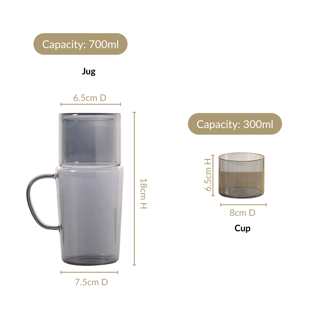Design: This set is crafted from tinted borosilicate glass, giving it a sophisticated grey-black hue while maintaining full clarity. The jug features a tall cylindrical body with a smoothly rounded base, paired with a minimal handle that blends seamlessly into the silhouette. The accompanying glass mirrors the same tint and shape, sized precisely to stack securely on top of the jug for a unified, compact profile.