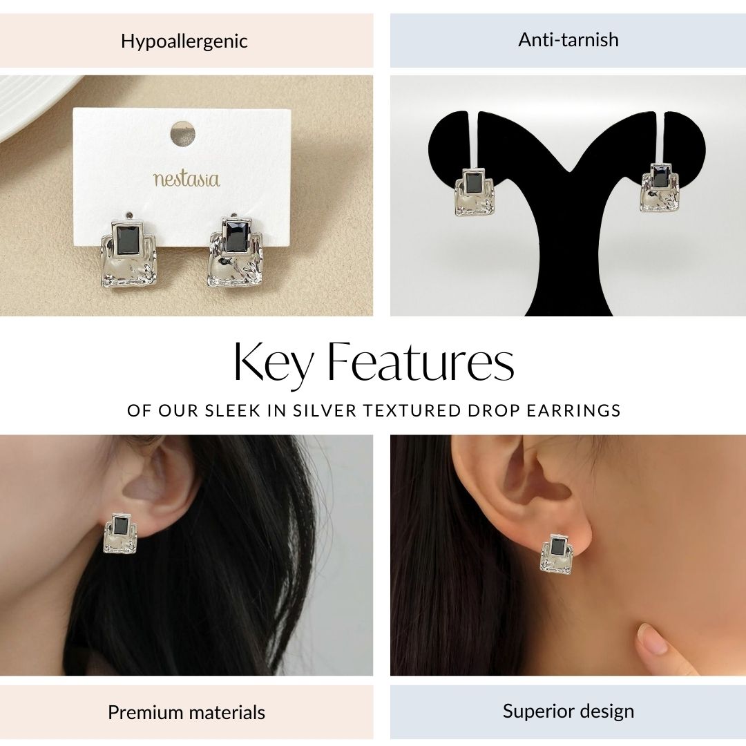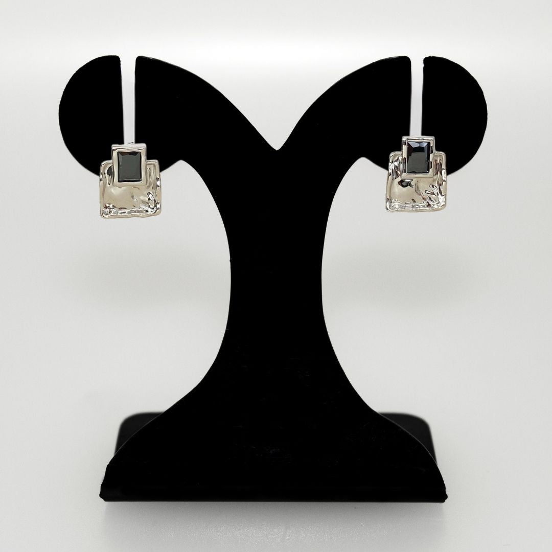Sleek, bold, and effortlessly chic, these silver-toned metal drop earrings showcase small rectangular resin black stones framed in textured silver-plated metal. The beaten finish on the metal adds an edgy, modern touch, making these earrings a standout accessory. Drawing inspiration from contemporary geometric design and the beauty of contrasting materials, they offer a striking balance of elegance and boldness. Perfect for both everyday wear and special occasions, these earrings bring a refined, modern flair to any outfit.