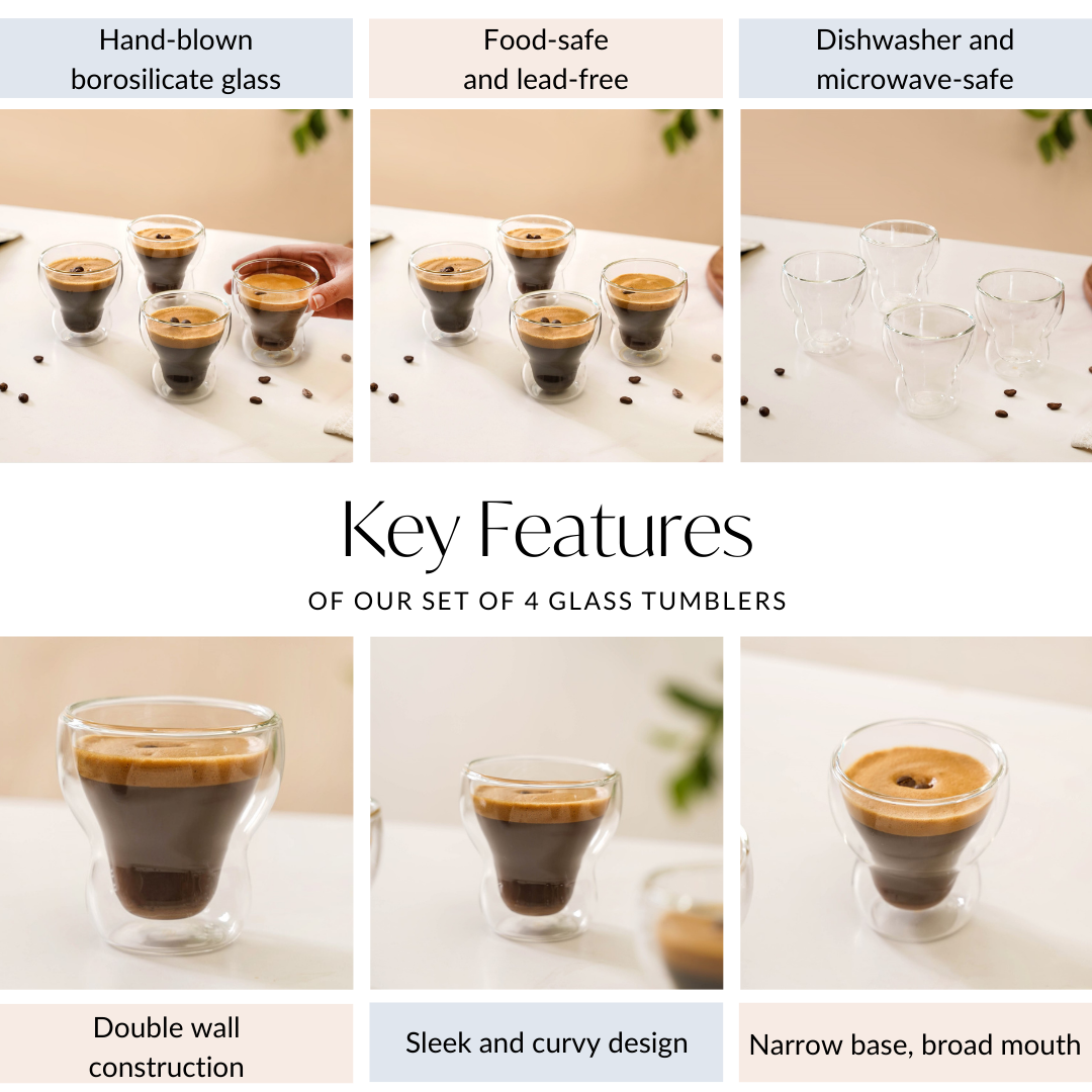 Benefits: Made from hand-blown borosilicate glass, these juice glasses are food-safe and lead-free, ensuring that your drinks are safe to consume. The double-wall construction keeps your beverages at the perfect temperature for longer, while the microwave and dishwasher-safe design makes for easy usage and cleaning.
