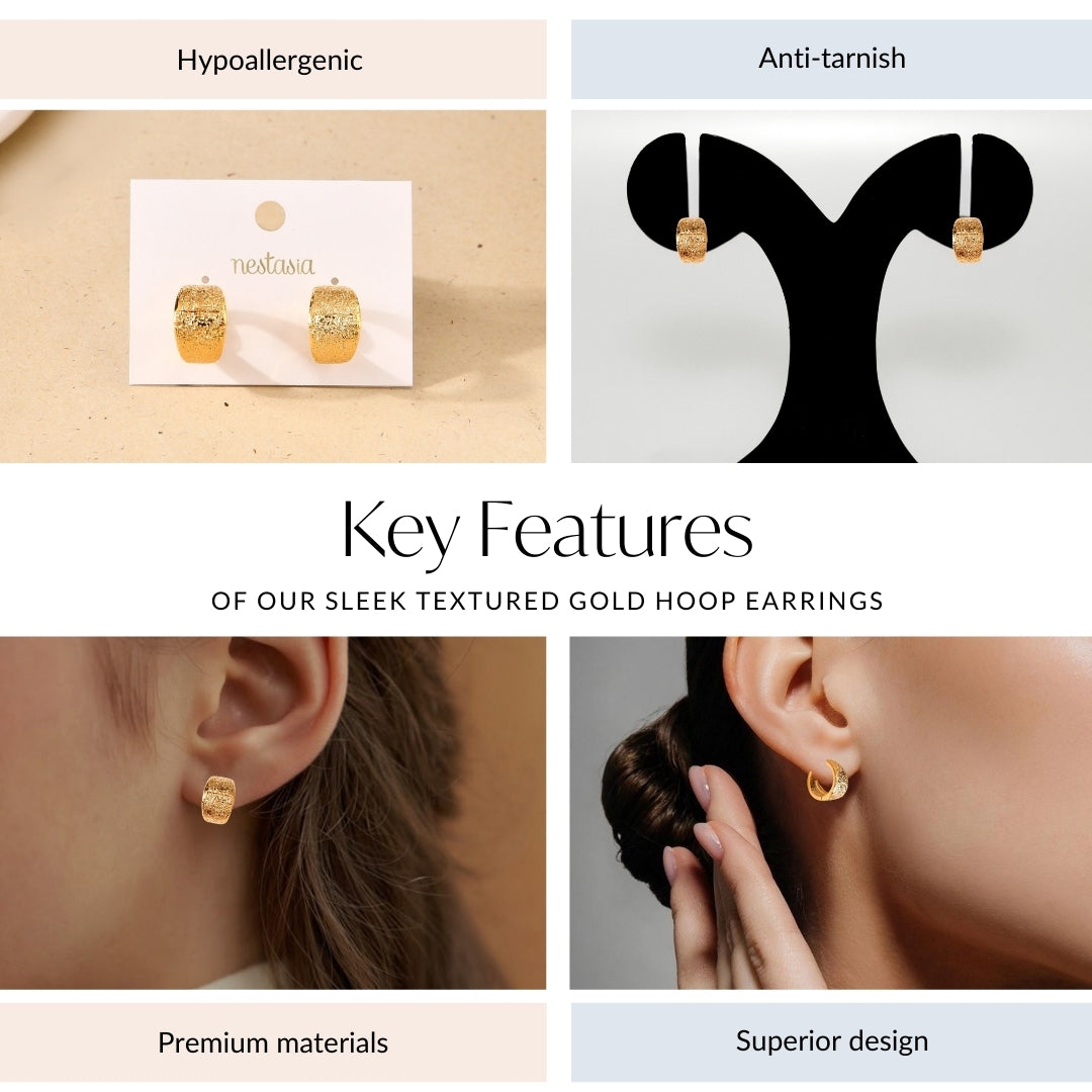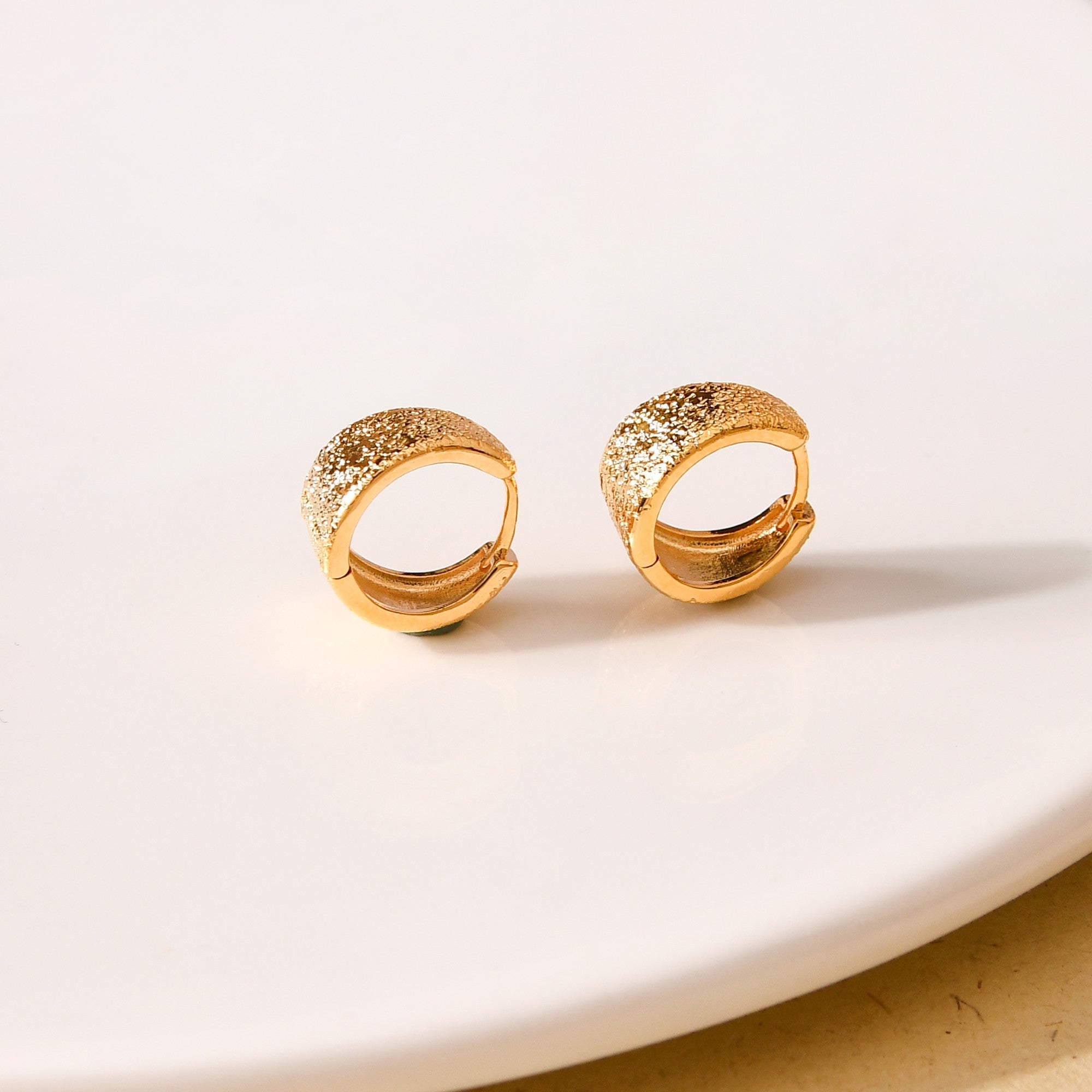 Glam up your everyday style with this pair of gold-plated small hoop earrings, designed to exude understated elegance. Featuring a chic textured finish, these hoops effortlessly combine classic appeal with a modern edge. The flexible hinge design ensures easy wearability and a secure fit, making them perfect for all-day comfort. Crafted with precision, the high-quality gold plating adds a radiant shine to any outfit, whether casual or formal. These versatile earrings are an ideal choice for adding a touch of sophistication to your costume jewellery collection.