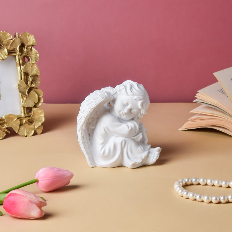 The white angel statue, crafted from resin, emanates a timeless vintage charm. Showcasing a serene sleeping posture, this exquisite decor item brings a sense of tranquility and innocence to any space. Its compact size makes it ideal for adorning table tops, infusing them with a touch of ethereal beauty and creating a serene ambiance.