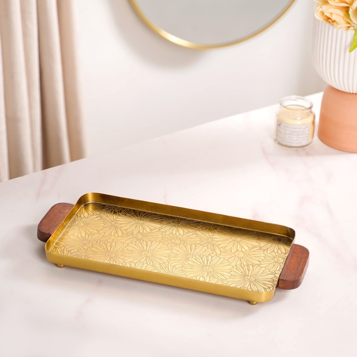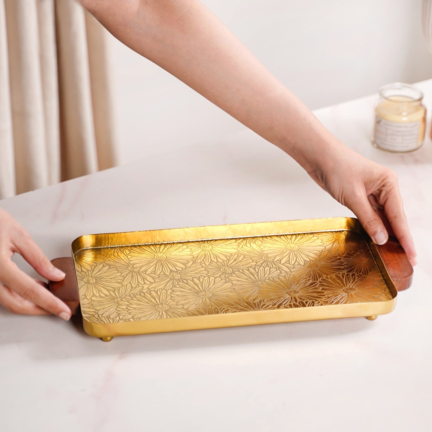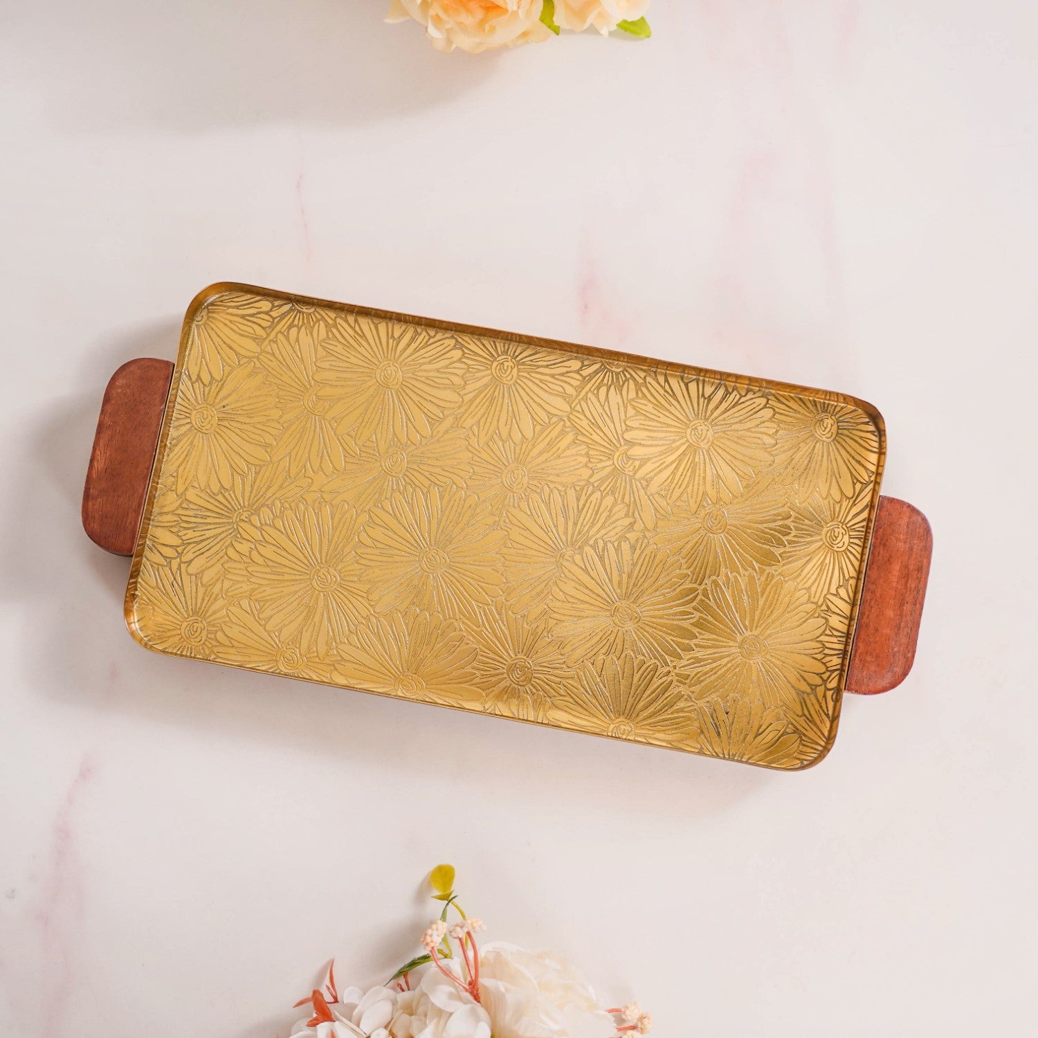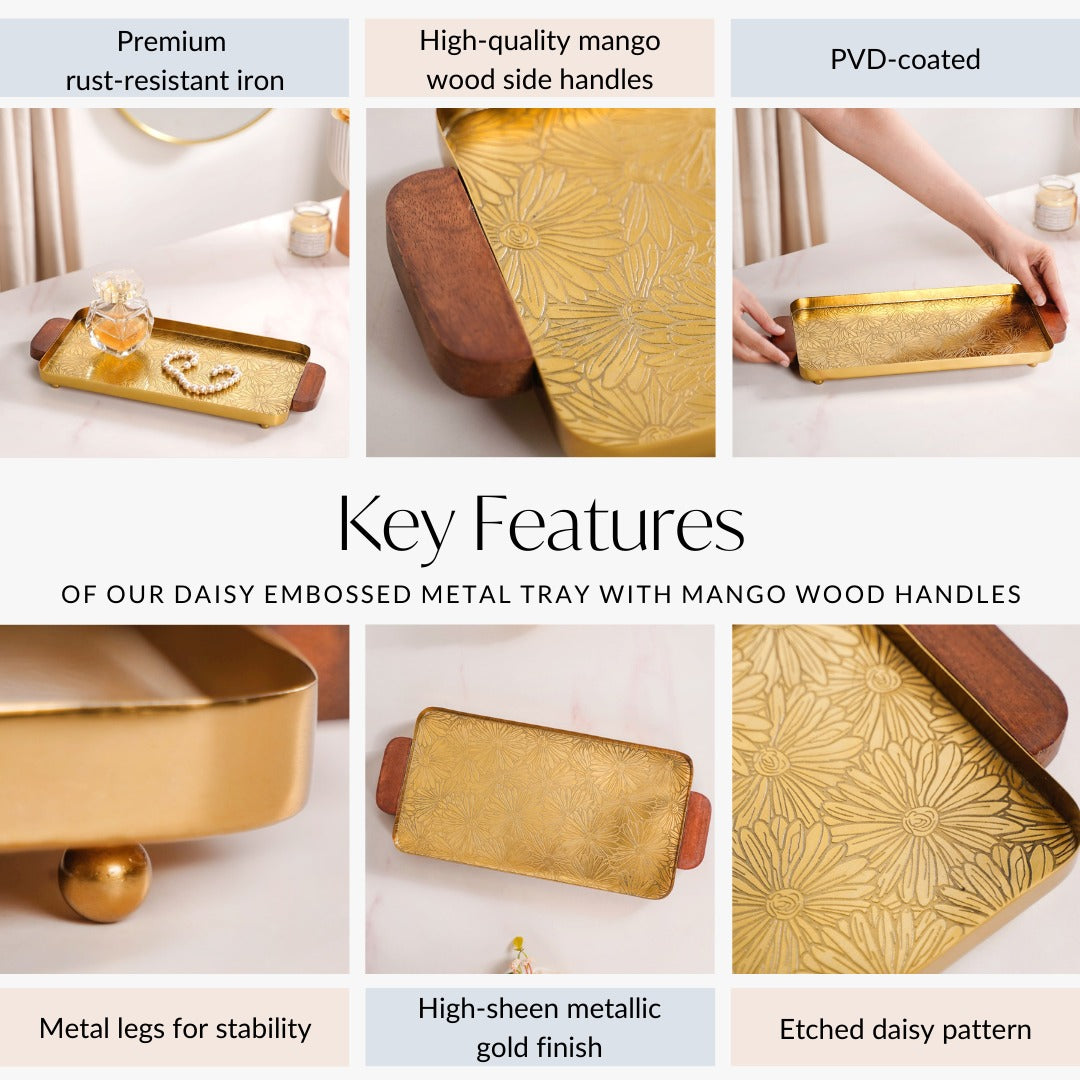 Design: Dressed in a regal gold finish, this metal tray combines elegance with durability. Its surface features a delicately etched daisy pattern, adding artisanal charm to any setting. Sturdy mango wood handles ensure a comfortable grip, while the metal legs provide stability and elevate the decorative tray to protect surfaces from heat when serving hot dishes.