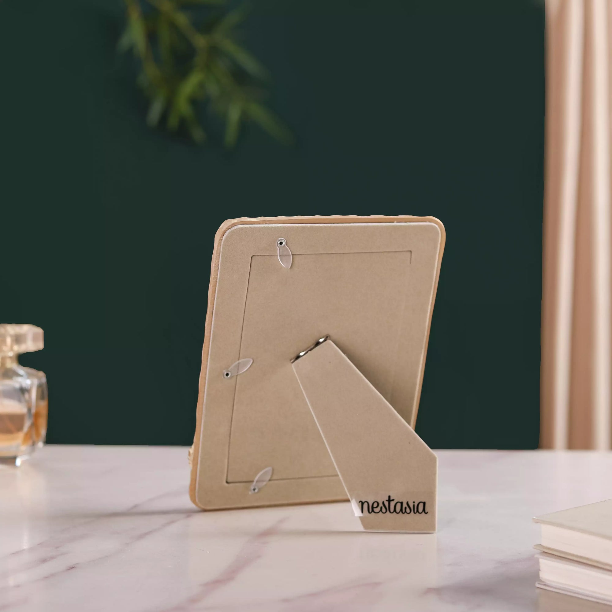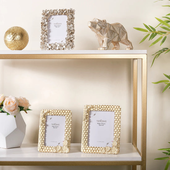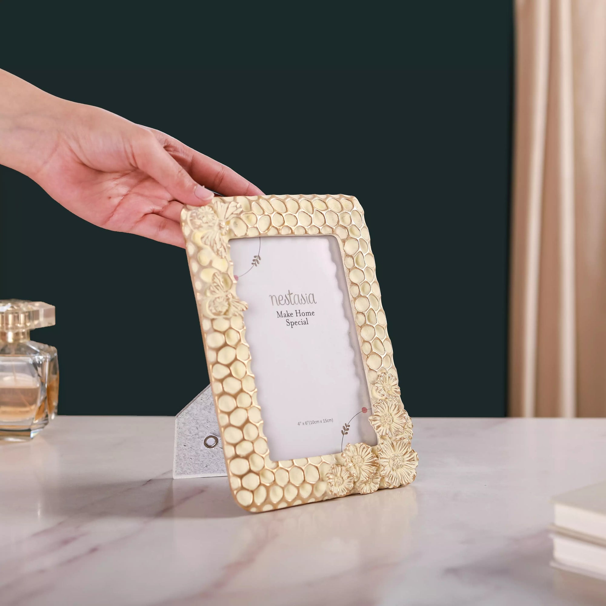 The golden honey comb photo frame is crafted from durable resin, ensuring its longevity and resilience. Resin is known for its sturdiness and ability to withstand daily use and handling. The frame's construction from high-quality resin materials ensures that it maintains its structural integrity and elegant appearance over time.