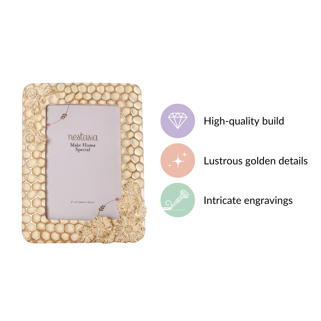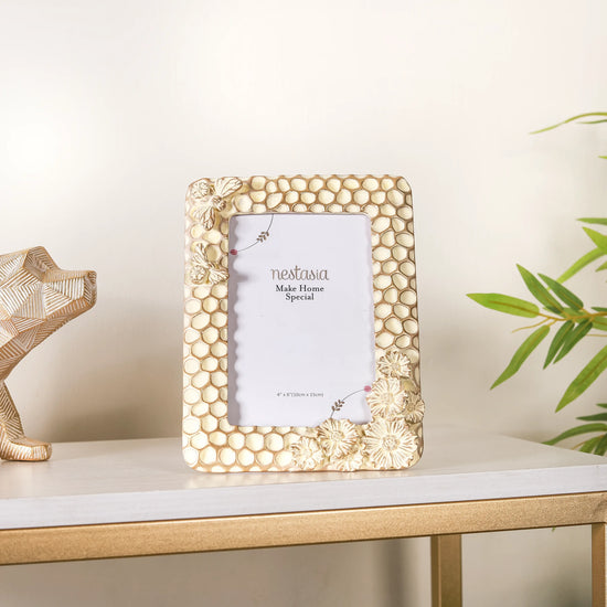 Experience the enchantment of our honey bee golden photo frame, a harmonious blend of artistic craftsmanship and nature's splendour. Expertly fashioned from durable resin, this picture frame boasts an alluring golden hue, complemented by an intricate honeycomb motif. Delicate honey bees grace one corner, while blossoming flowers adorn the other, seamlessly intertwining nature's beauty with contemporary design. As your cherished memories find their place, this frame takes centre stage, radiating an aura of refinement and capturing admiration.
