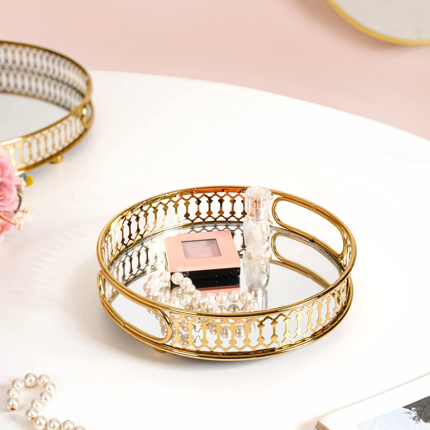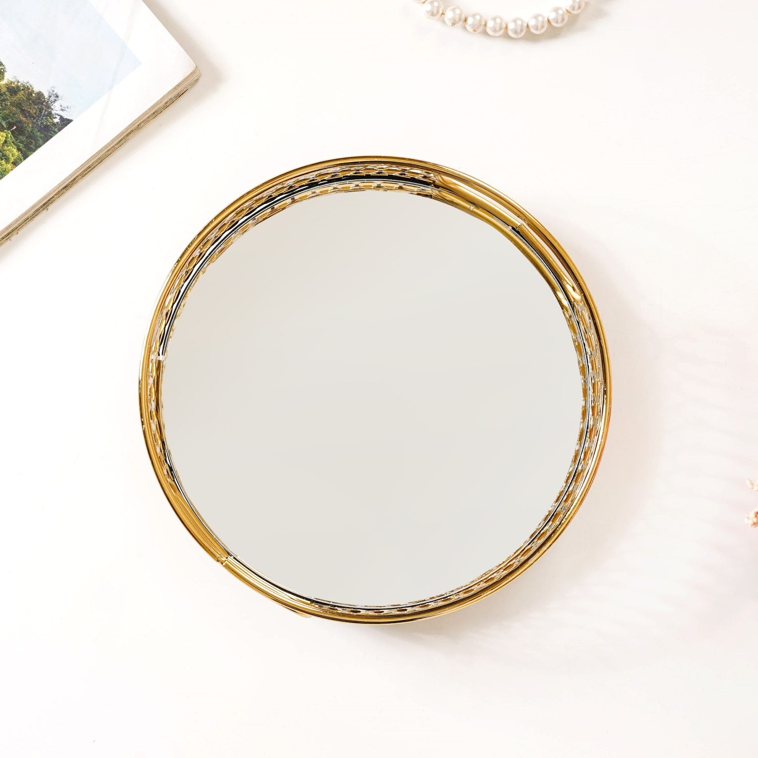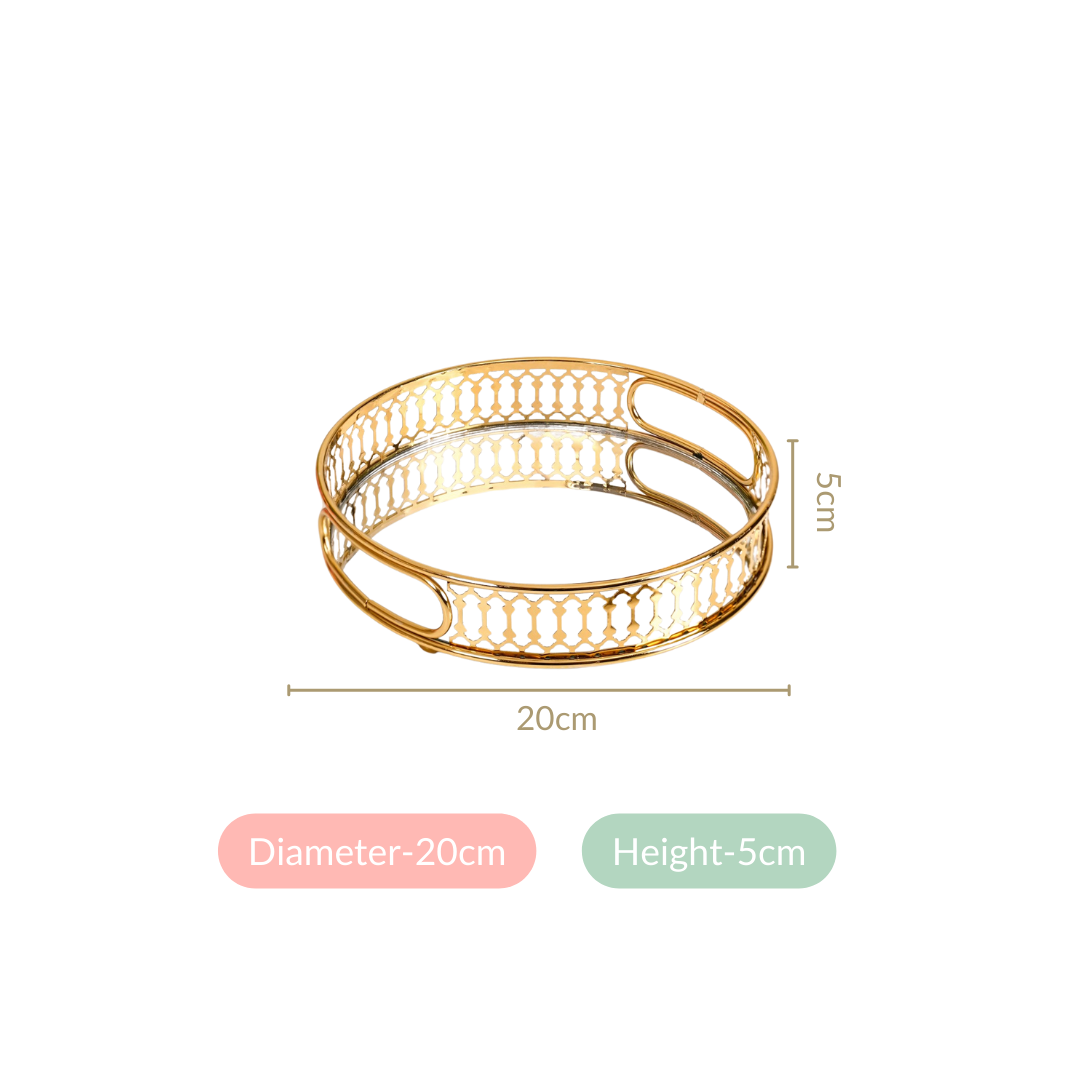 Design: The round tray features an intricate rim design with a luxurious metallic gold finish, adding a touch of sophistication to any setting. Its crystal clear mirror base reflects light beautifully, enhancing the ambience of your space. Easy-grip handles make it convenient to carry, while the sturdy metal legs ensure stability.
