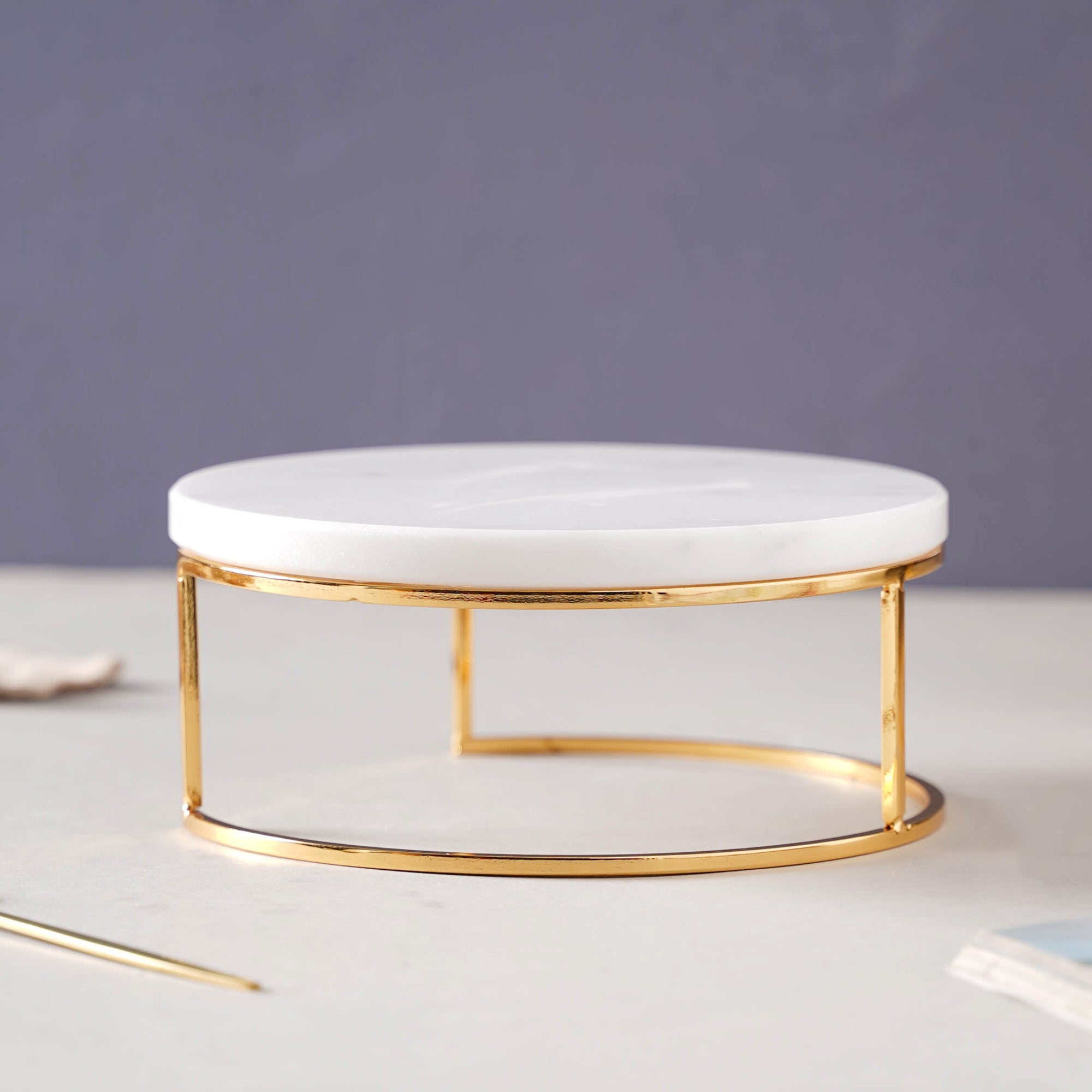 The round marble tray with an elevate stand is perfect as an accent piece. Display cosmetics and scents to add that extra touch of style and creativity. The gold metal stand makes it a unique buy. Nestip: Add a candle and some dry flowers to elevate any living space Size: 17.5cm D x 8cm H Color: White and gold Material: Marble and metal Products included: 1 marble tray with metal ring stand Style: LJSF47S52