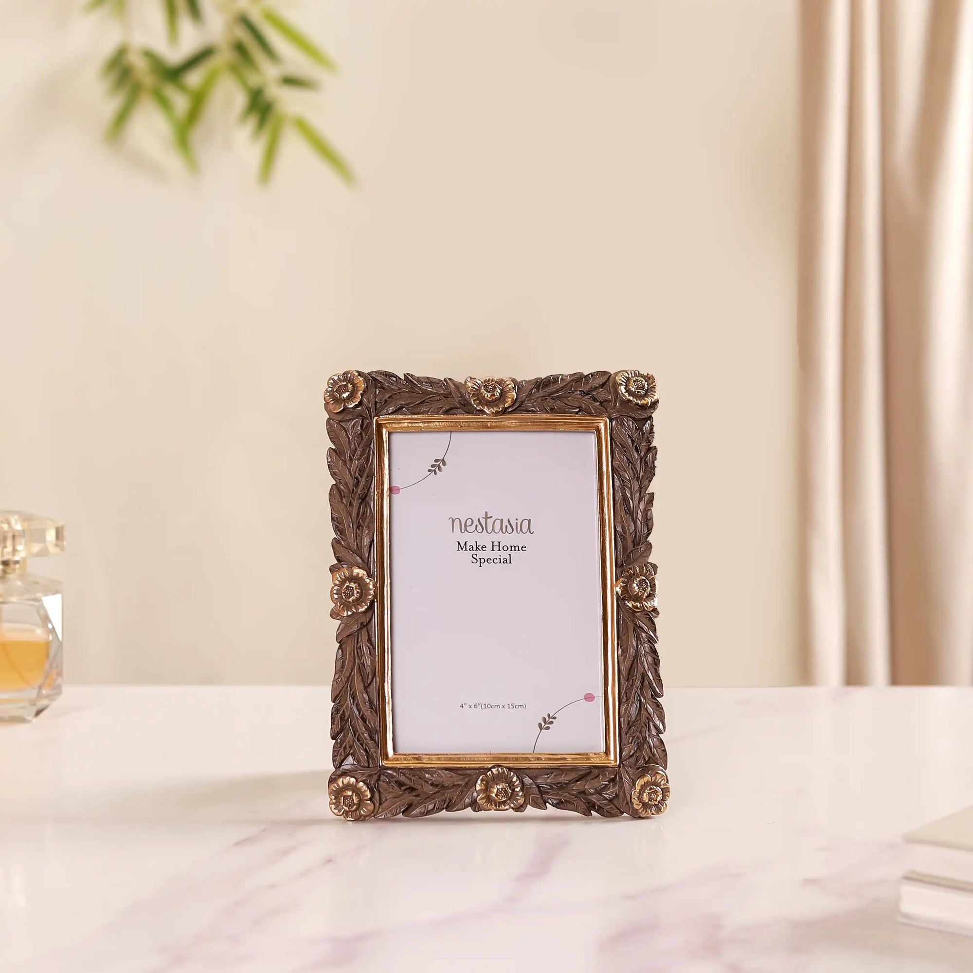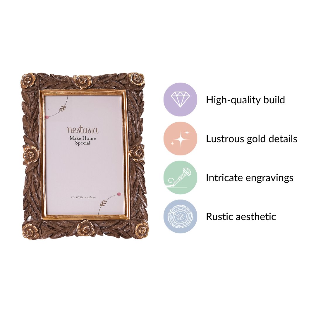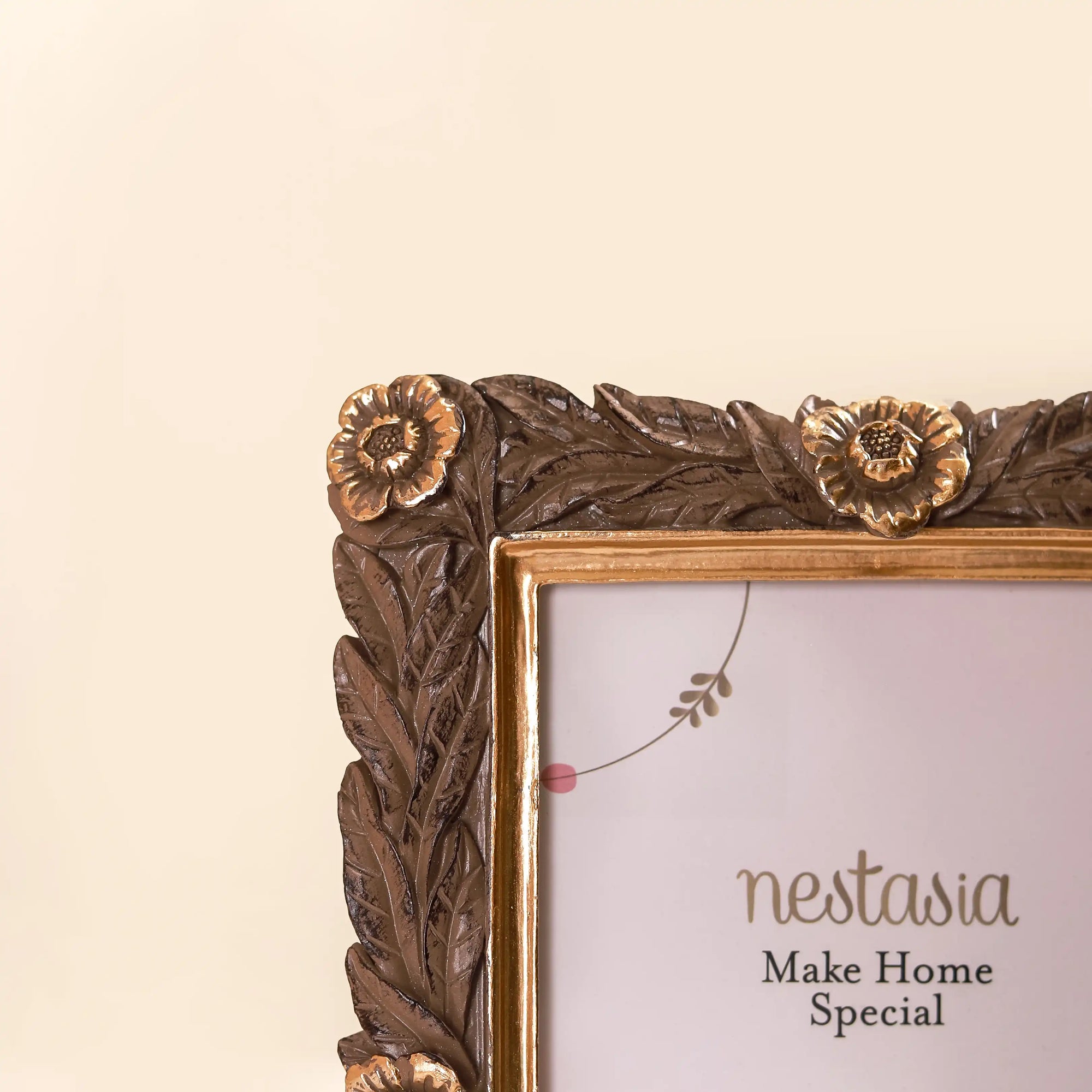 Immerse yourself in the enchanting world of our vintage photo frame. The rectangular frame boasts an intricately carved leaf and delicate gold flower border, radiating antique & organic beauty. Meticulously crafted from durable resin, this photo frame captures nature's elegance, providing a stunning backdrop for your treasured memories. Elevate your home decor with this captivating piece that adds warmth, character, and rustic splendour to any space. Watch your photographs come to life within the rustic photo frame.