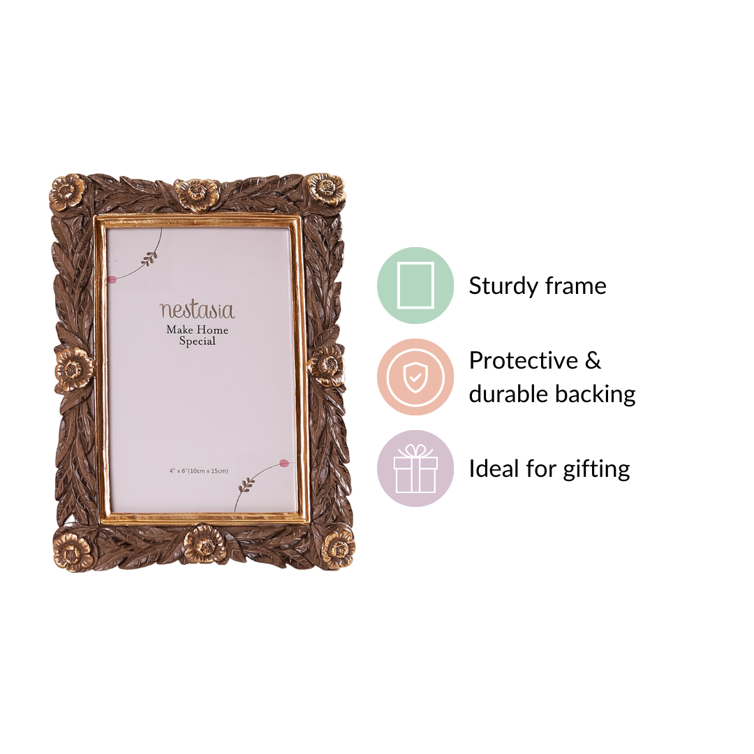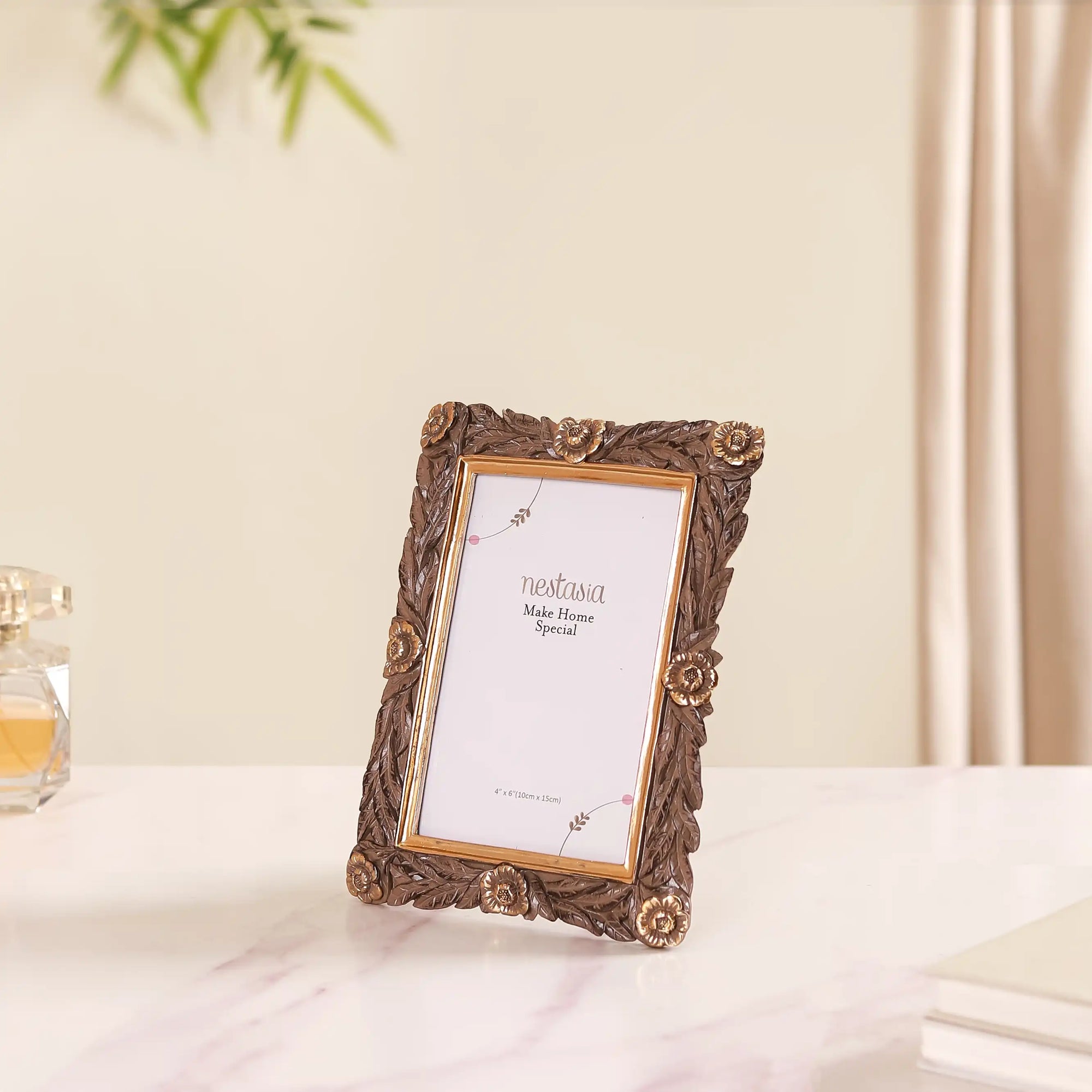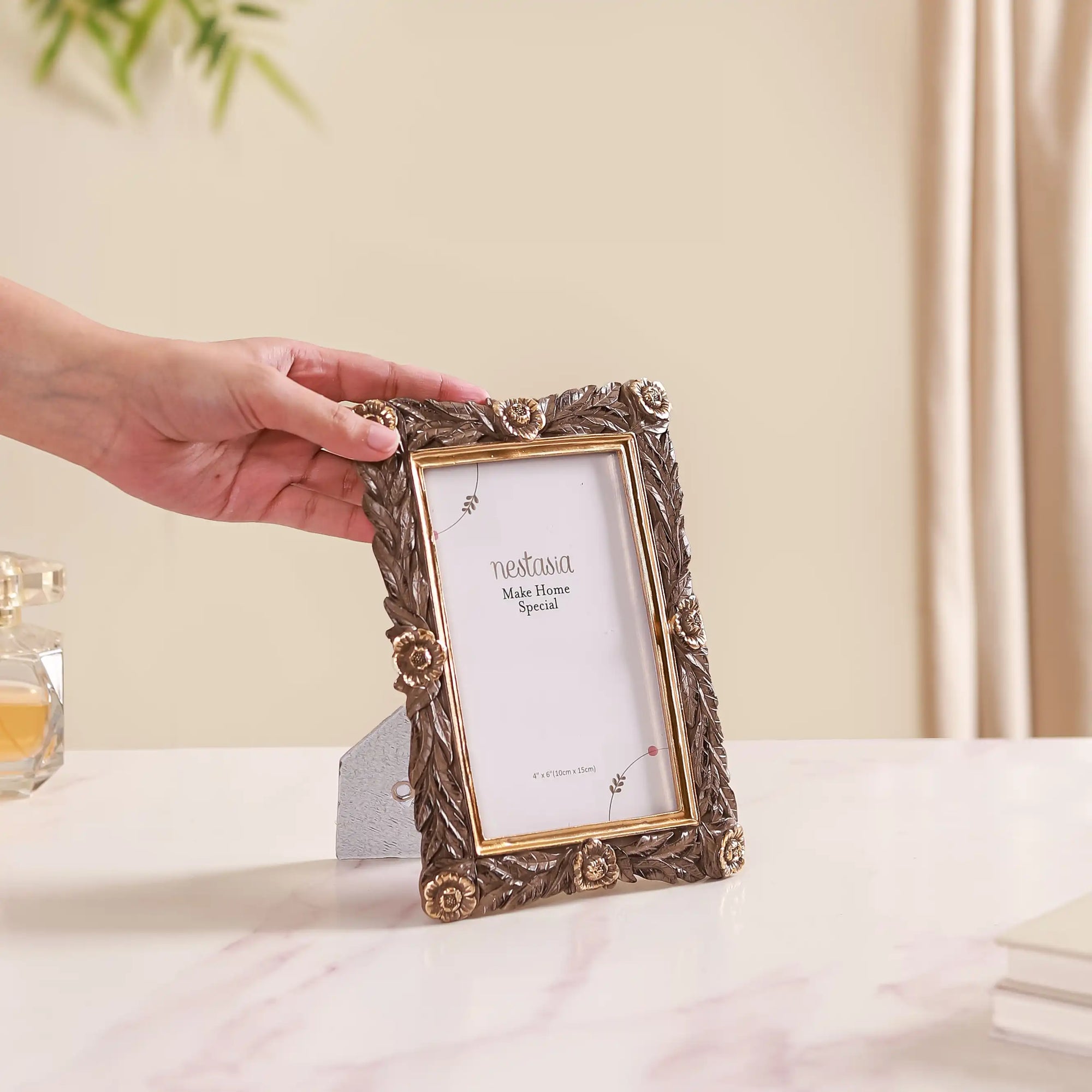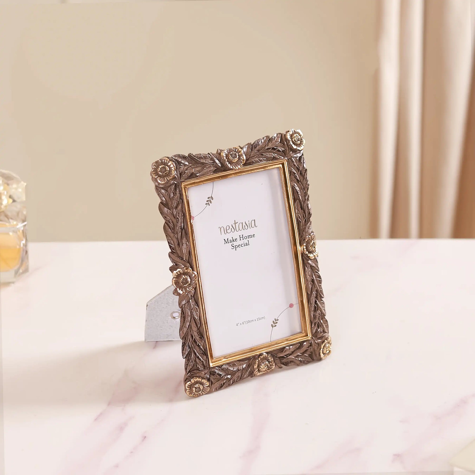 Immerse yourself in the enchanting world of our vintage photo frame. The rectangular frame boasts an intricately carved leaf and delicate gold flower border, radiating antique & organic beauty. Meticulously crafted from durable resin, this photo frame captures nature's elegance, providing a stunning backdrop for your treasured memories. Elevate your home decor with this captivating piece that adds warmth, character, and rustic splendour to any space. Watch your photographs come to life within the rustic photo frame.