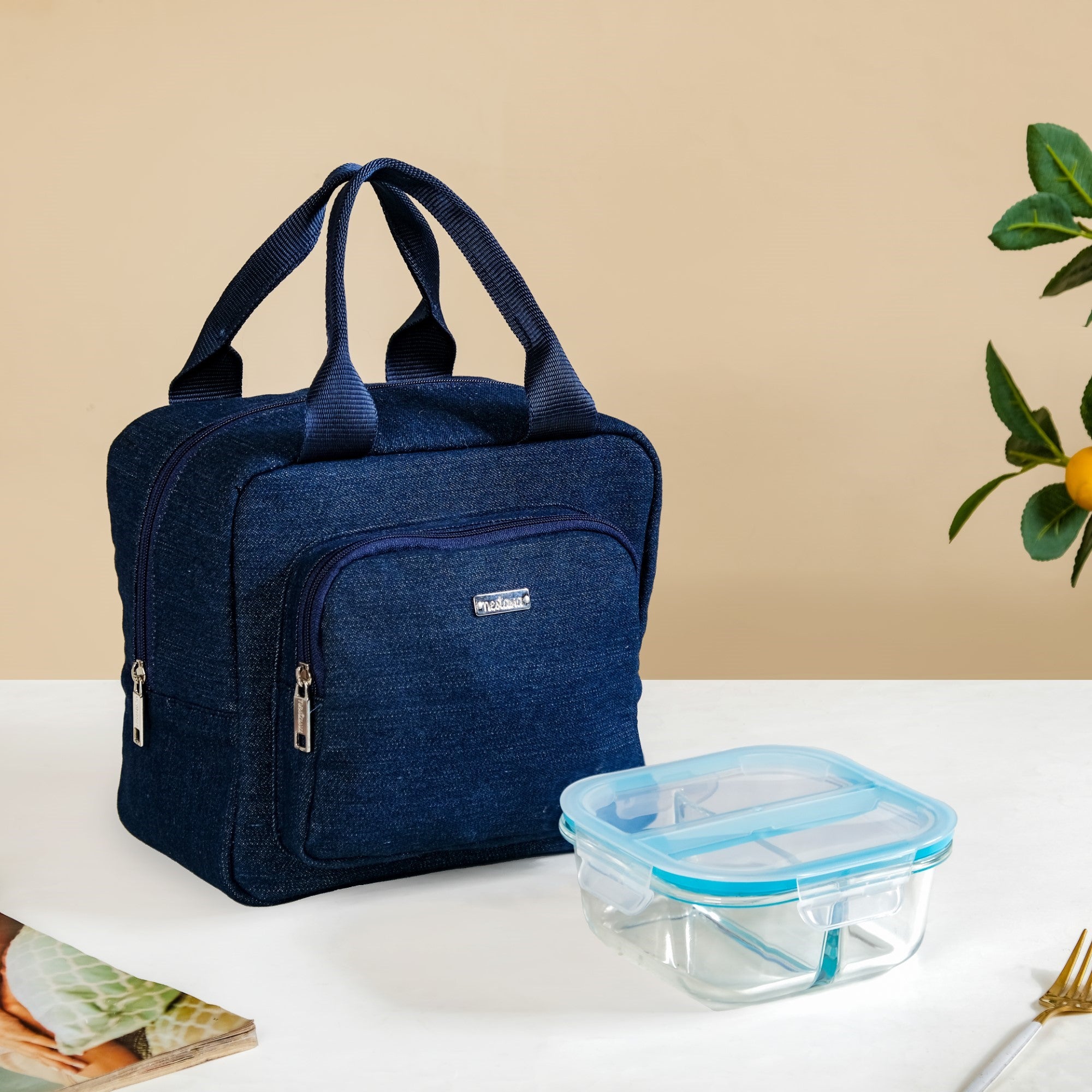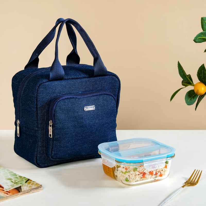 Stack up on convenience and snack in style with our new lunch hamper—your ultimate on-the-go meal companion. The sleek denim lunch bag, designed with dual compartments and thermal insulation, keeps your meals hot and your drinks refreshingly cool. Paired with a premium borosilicate glass lunch box featuring two spacious compartments and an airtight, leak-proof lid, this hamper ensures every bite is fresh, hassle-free, and perfectly packed. The lunch box is also food-safe and lead-free to protect your health and maintain sustainability.