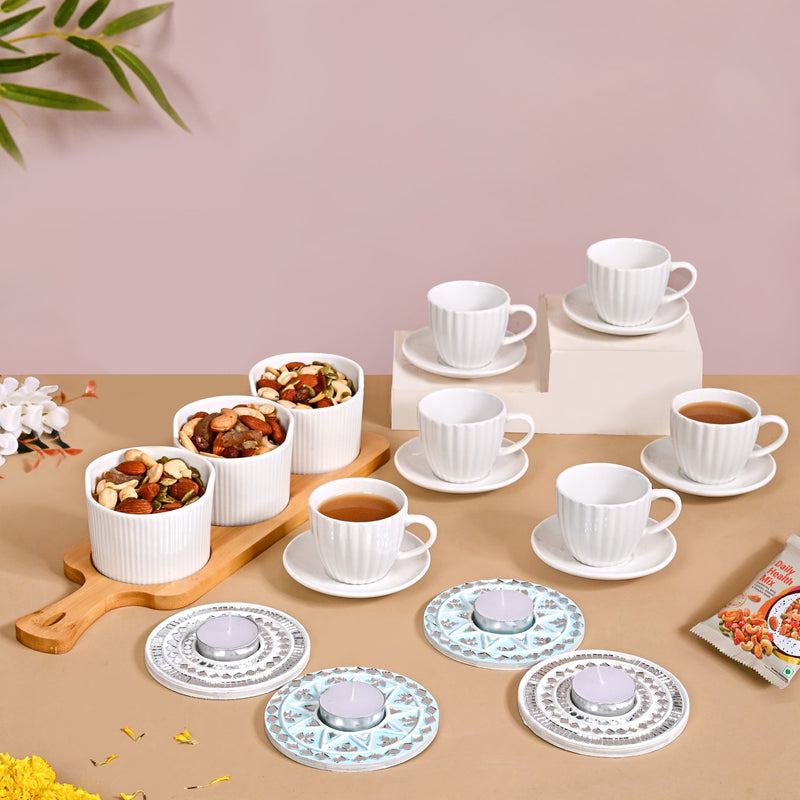 Add sparkle to the Diwali celebrations with our exquisite gift hamper, featuring a decorative tray, a set of six ceramic mugs, and a set of six stunning tealight holders. The tray showcases an intricate rim design with a metallic gold finish and a crystal-clear mirror base, perfect for elevating any occasion.
