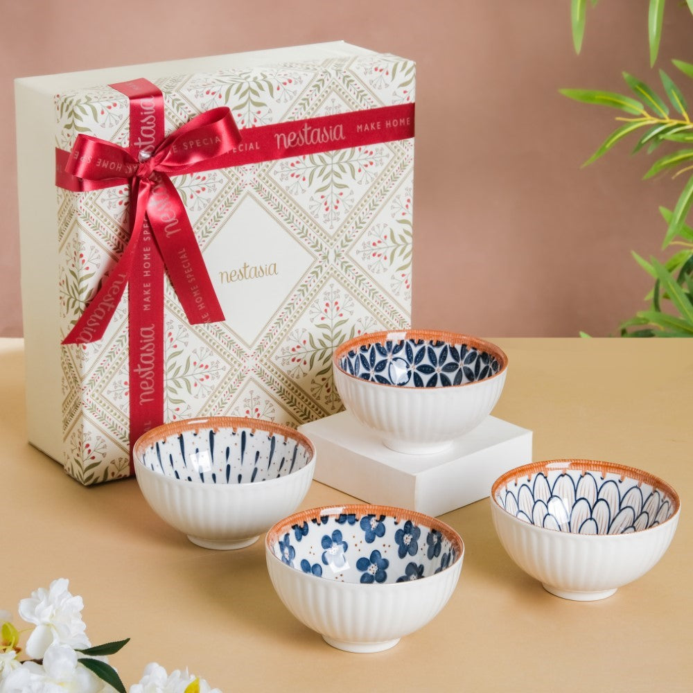 A bowl set is a versatile and practical gift that is perfect for a variety of occasions and festivities, hence we have curated a set that would definitely be your selection at first sight. The patterned bowl set of 4 comprises various elements of nature- bloom, dewdrop, floral patterns. Whether it's for a housewarming party, a wedding, a birthday, or Thanksgiving, a bowl set is sure to be appreciated by any recipient. It can be used for serving snacks, holding fruit, or as decorative pieces at home. The microwave-safe and dishwasher-safe bowls come in safe, gift packaging which makes them ideal for gifting.