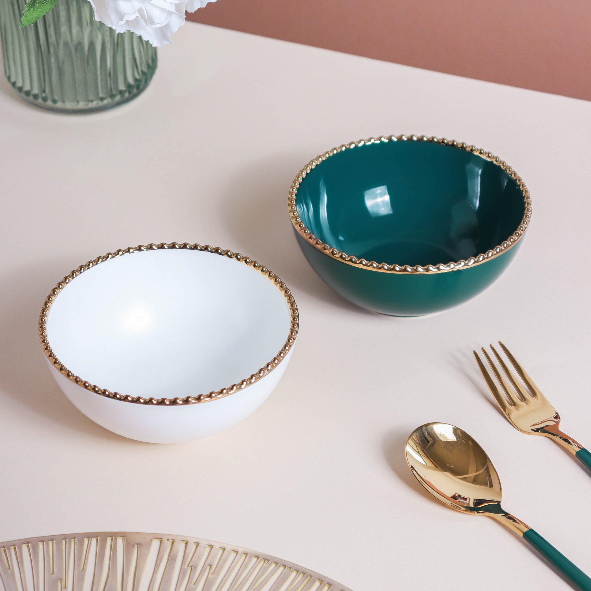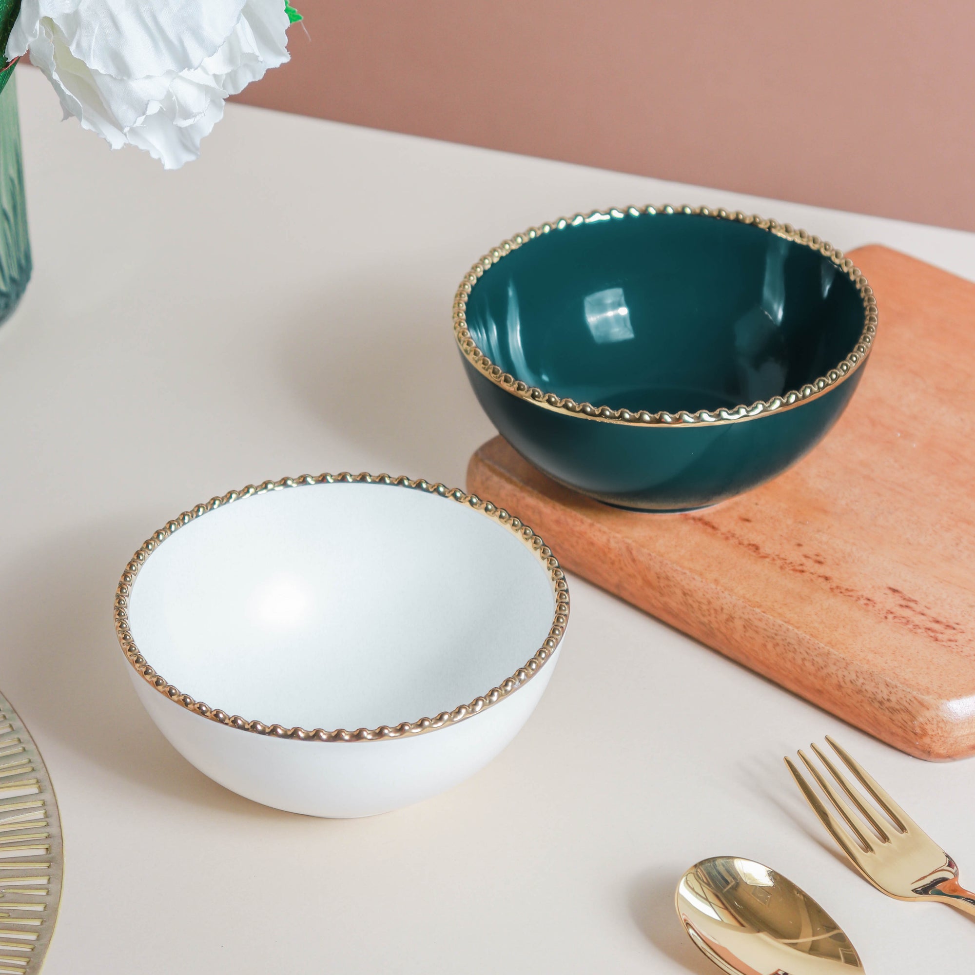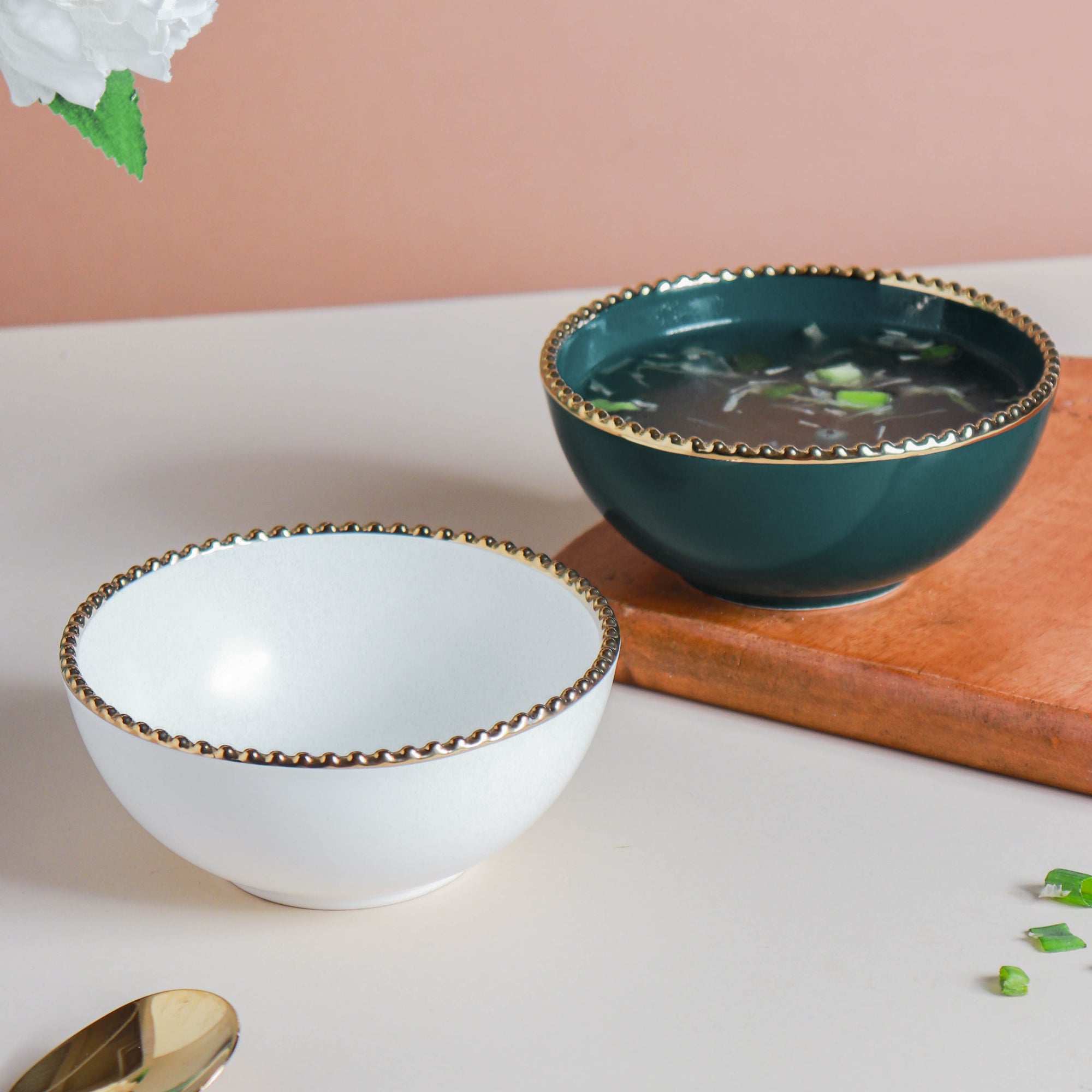 The ceramic snack bowls, with gold rim, are a stunning piece of crockery on any contemporary table. The elegant design of the ceramic bowl makes it a must-have in every household. The gold rim bowls are quite versatile and can be used to serve lentils with gravy or any broth with dumplings or even as snack or appetizer bowls. The snack bowls come in two vibrant color variants.