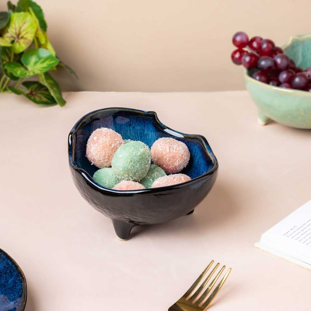 With the abstract-designed handcrafted ceramic bowl, enjoy the everlasting beauty of the ocean with the gorgeous blue colour at every meal. The handcrafted bowl's unique form is entirely original and beautifully polished with gorgeous patterns. The stoneware inspired snack bowl has been crafted in order to add charm and value, and no detail has been missed to make it a unique addition to the table. One can display the bowl as a stand-alone gallery design piece or use the ceramic bowl with legs as regular dinnerware.