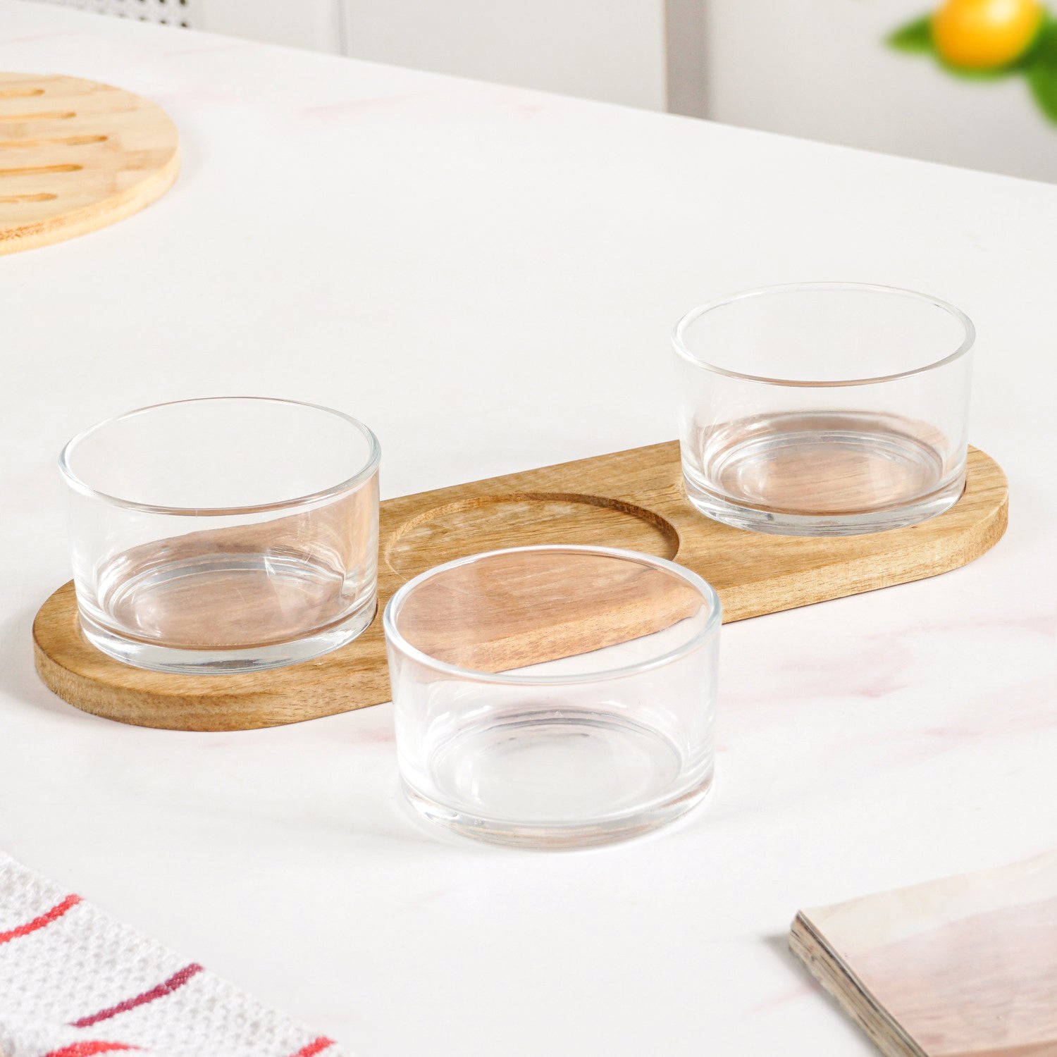 Serve style and flavour with this acacia wood tray and snack bowls. The wooden serving tray with glass bowls makes snacking easier, more organised, and instantly party ready.