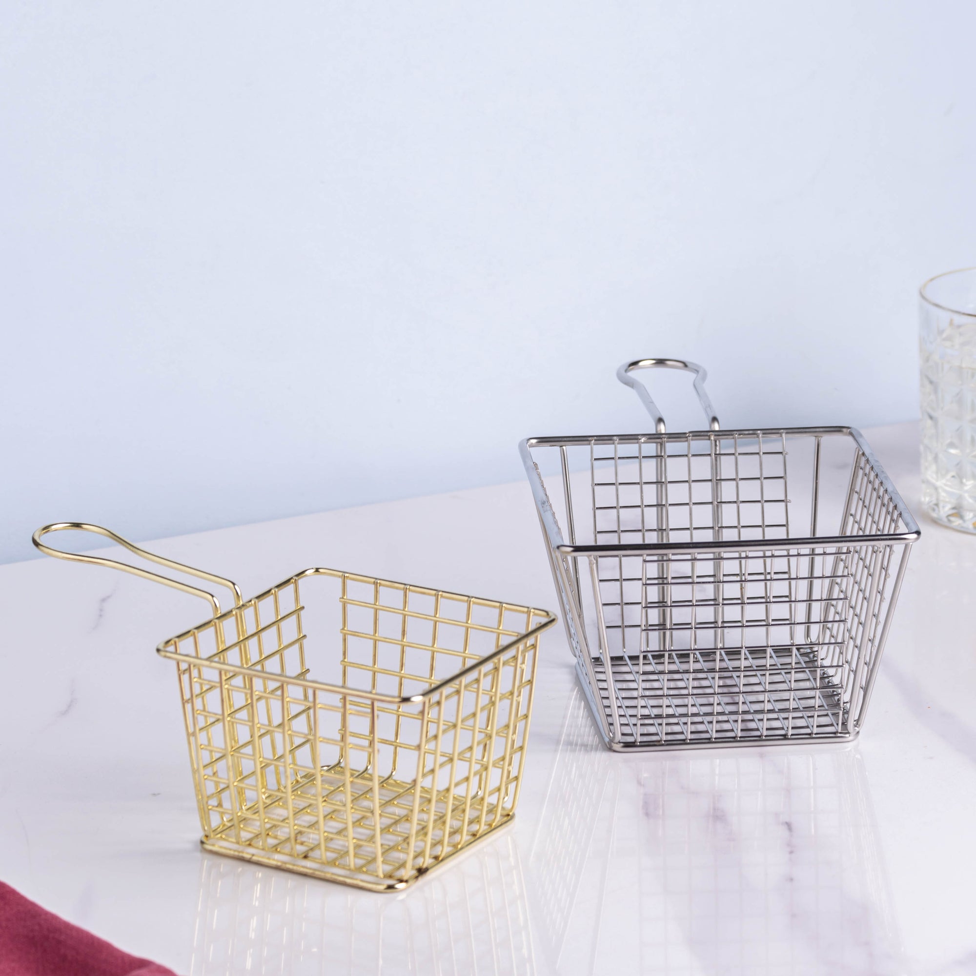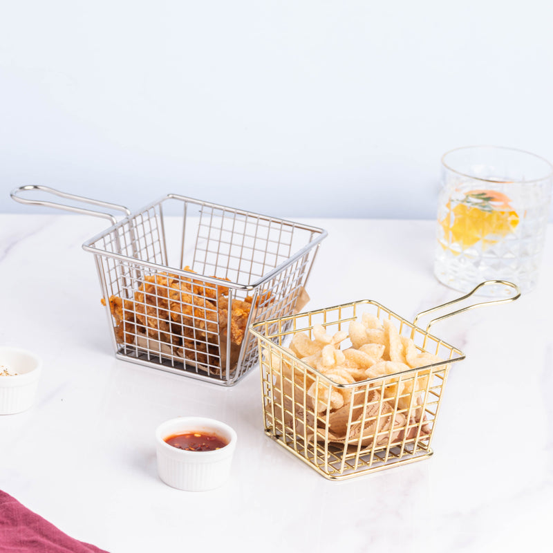 The vintage wire deep fat fryer basket is a must-have for every kitchen where the owner enjoys making snacks at home for children/family members or people who love preparing snacks for get-togethers and parties of all kinds of events. The twin ears on opposite sides of the square baskets make it simple to place and pass the hot meal as well as to comfortably fix and remove it from an oil pan. The mesh wire-structured stainless steel basket also works well as a rustic plant pot holder, egg collection basket, and fruit basket. French fries, chicken nuggets, fish fingers, prawns, and more delectable foods may all be prepared and served using the frying basket. The basket has a dual purpose: it may be used for draining excess oil or water, and feeding visitors and family members at the coffee table. The basket prevents its contents from clumping together removing the hassle of constantly having to shake the basket while frying.