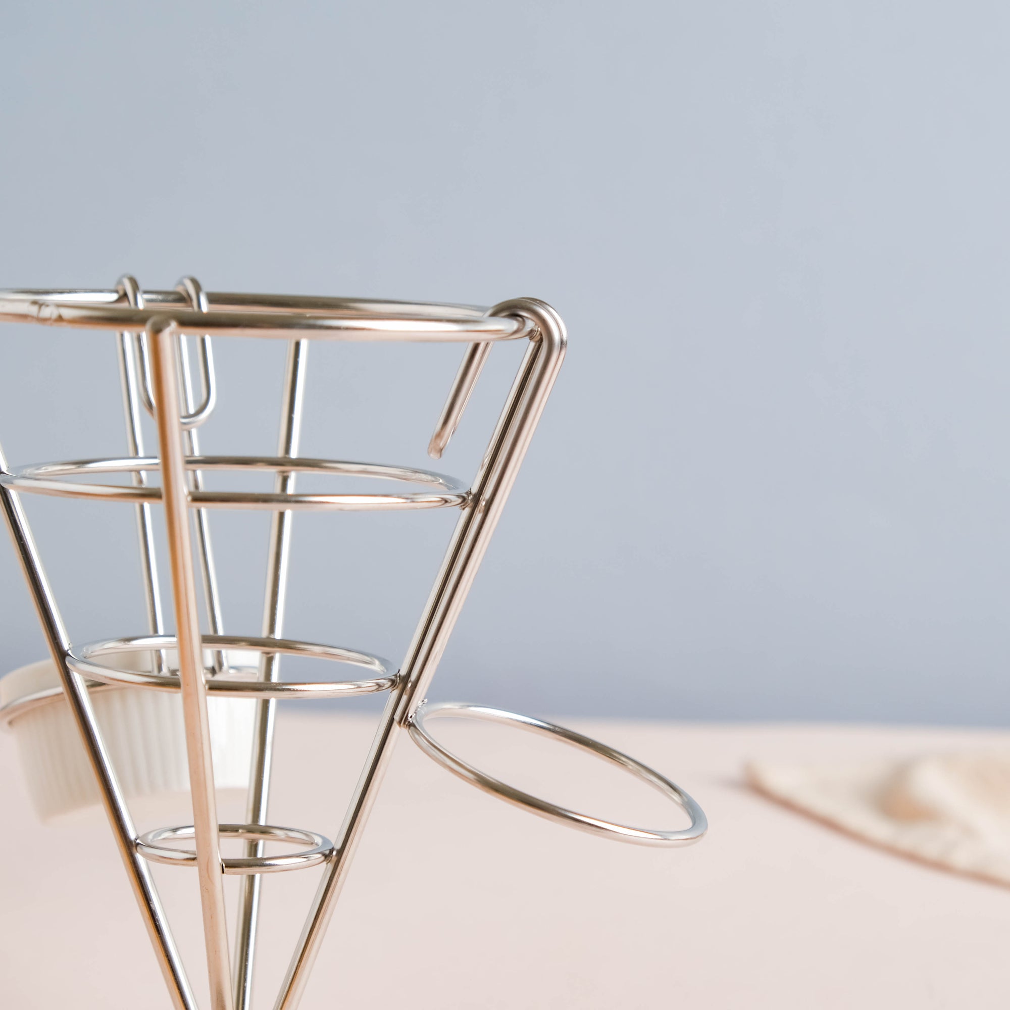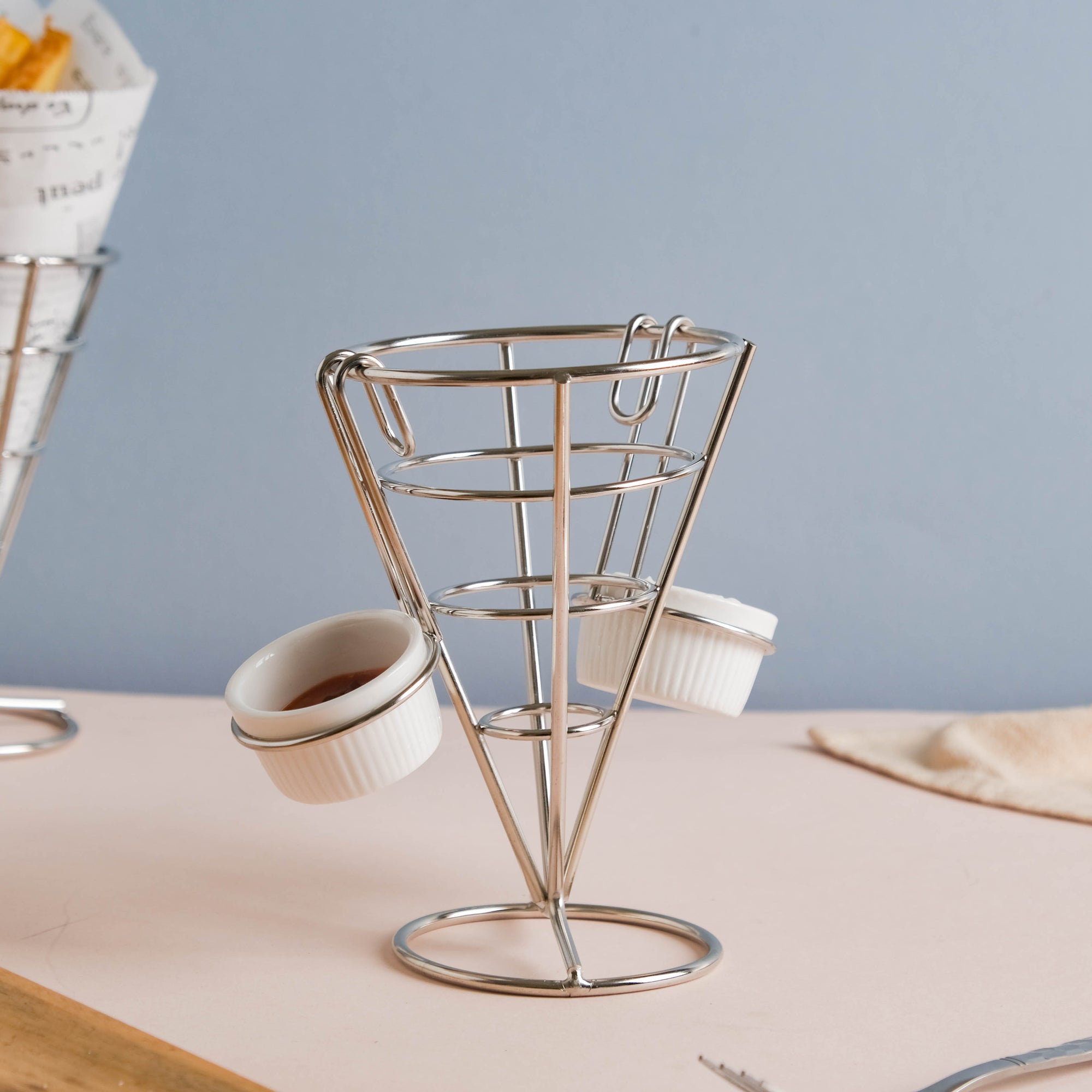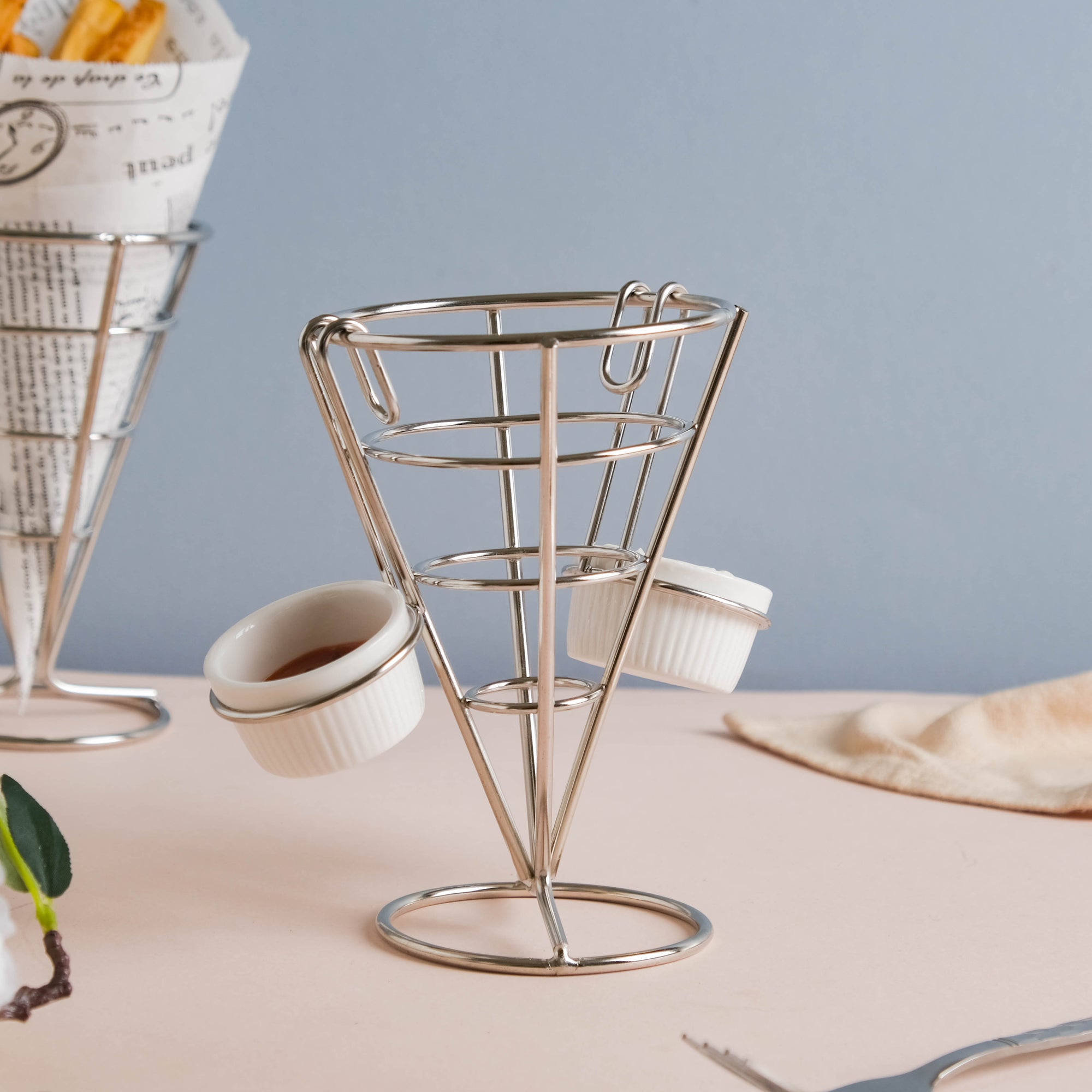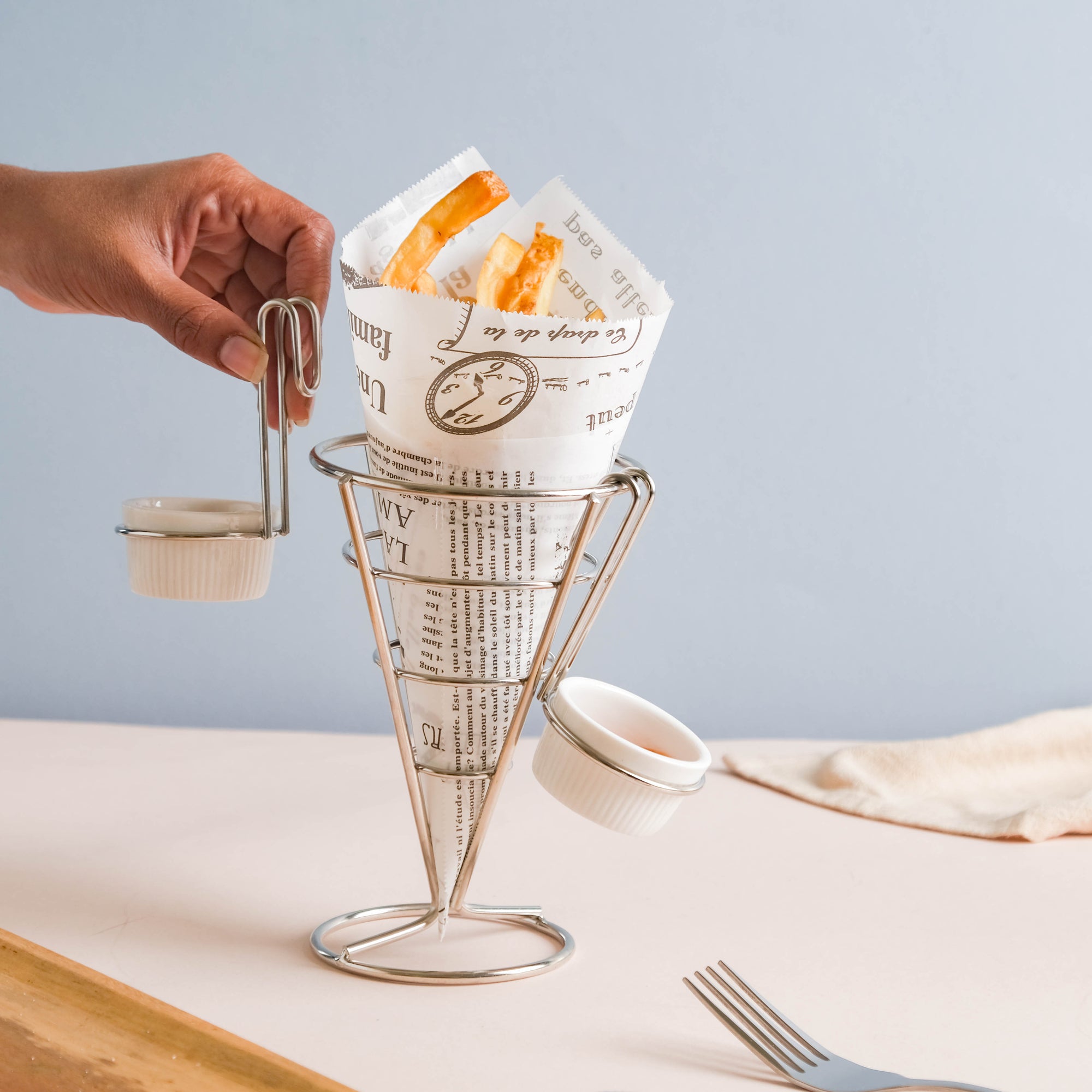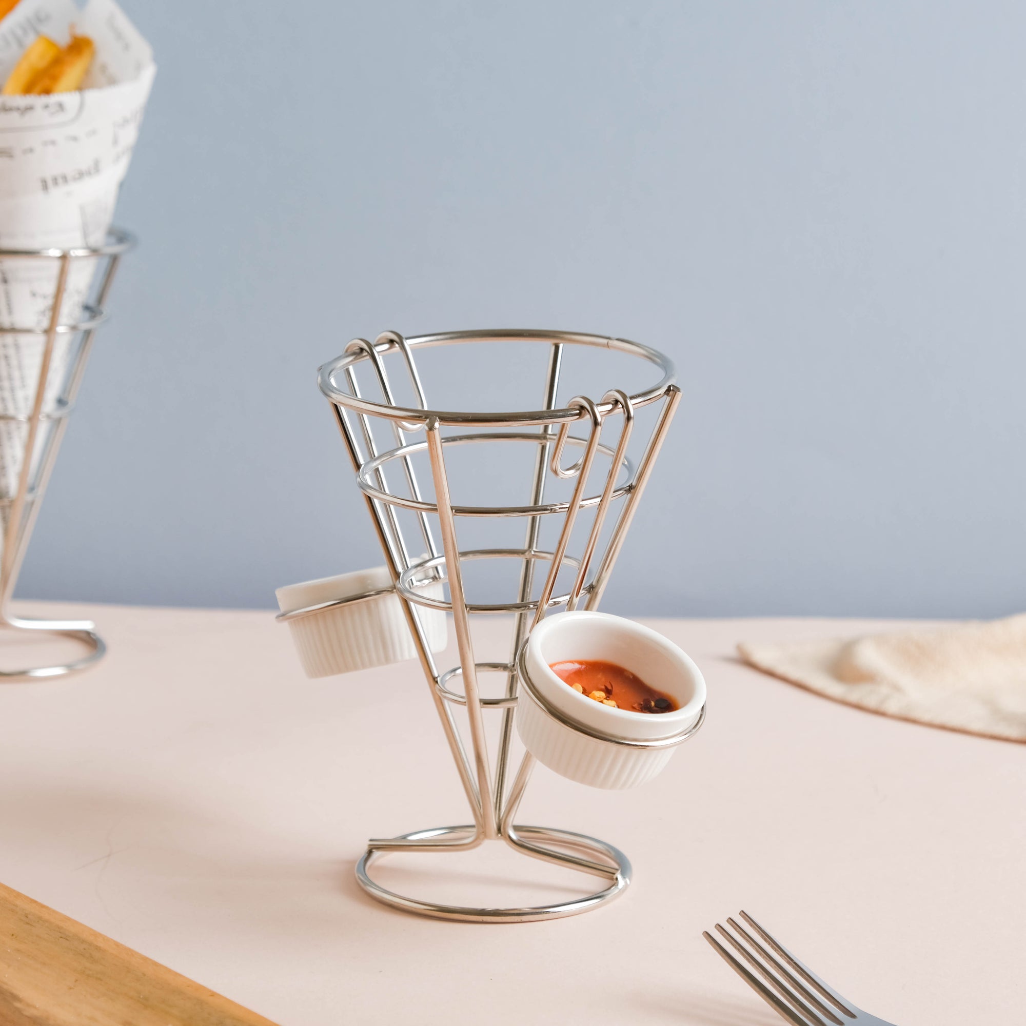 The silver metal snack basket is a magnificent kitchen, table, and home décor element, demonstrating the breadth of its use. The strong basket makes dipping, dunking, and binge eating goodies so much more enjoyable with the option of hanging sauce cups for ketchup, mayonnaise, salt, pepper, or other spices at its side. All that is required is to wrap a tissue or butter paper on the inner surface and pour the fries and nuggets into the cone; they are then ready to serve at the table. The snack baskets contribute to the table's visual charm by seeming eccentric and giving a whole new approach to preparing solitary or bigger portions.