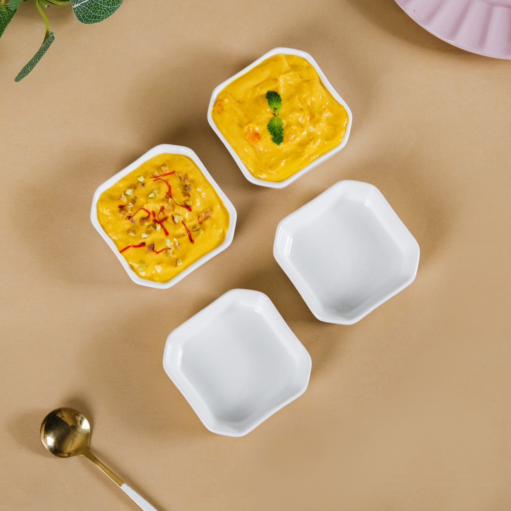 Our set of four ceramic dip bowls exudes both sophistication and utility. With a timeless white hue, these bowls seamlessly complement any table setting, whether adorned with vibrant pastel dishes or traditional gold and white plates. Beyond their primary function for serving sauces, these versatile bowls can also elegantly present mayo dips, chutneys, or petite dessert portions.