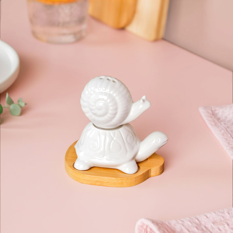 Design: Crafted from premium-quality ceramic, this set features a tortoise-shaped salt shaker and a snail-shaped pepper shaker, each adorned with intricate carved details that highlight their delicate features. The tortoise sits on a sleek bamboo stand with engraved sections to hold it securely, while the snail stacks atop the tortoise, as if enjoying a cosy ride on its back, bringing a quirky, artistic charm to your table.