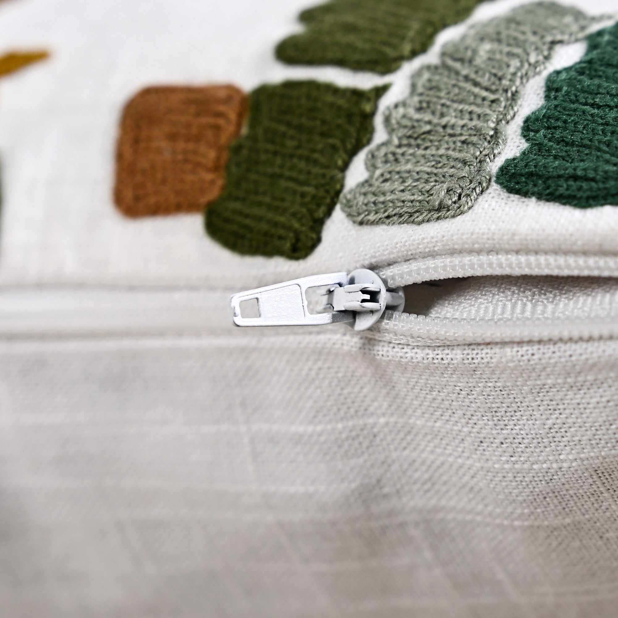 Design: The couch cushion cover features a beautiful Christmas tree design, delicately embroidered on a smooth, white cotton chambray fabric. Both hand and machine-embroidered techniques ensure a unique, high-quality finish. The four tassels at each corner add a playful and elegant touch, enhancing the overall aesthetic.