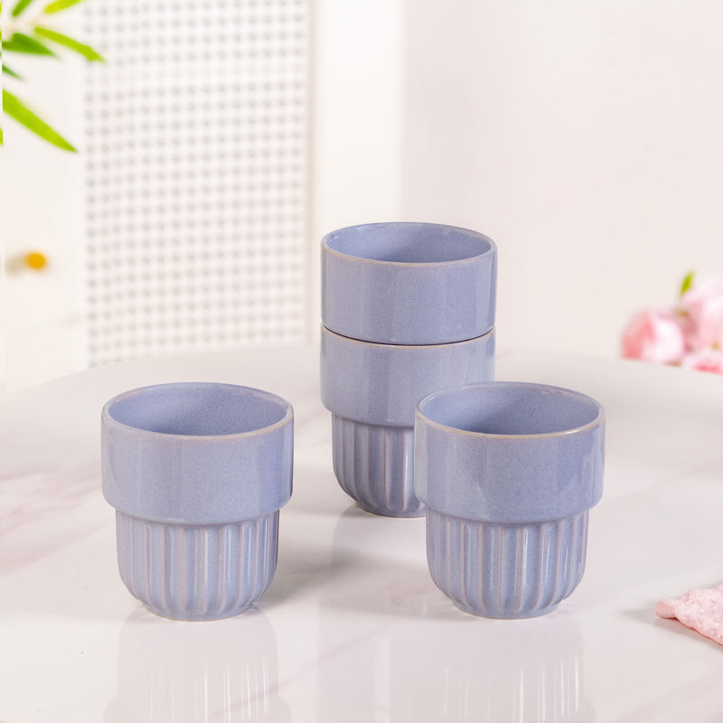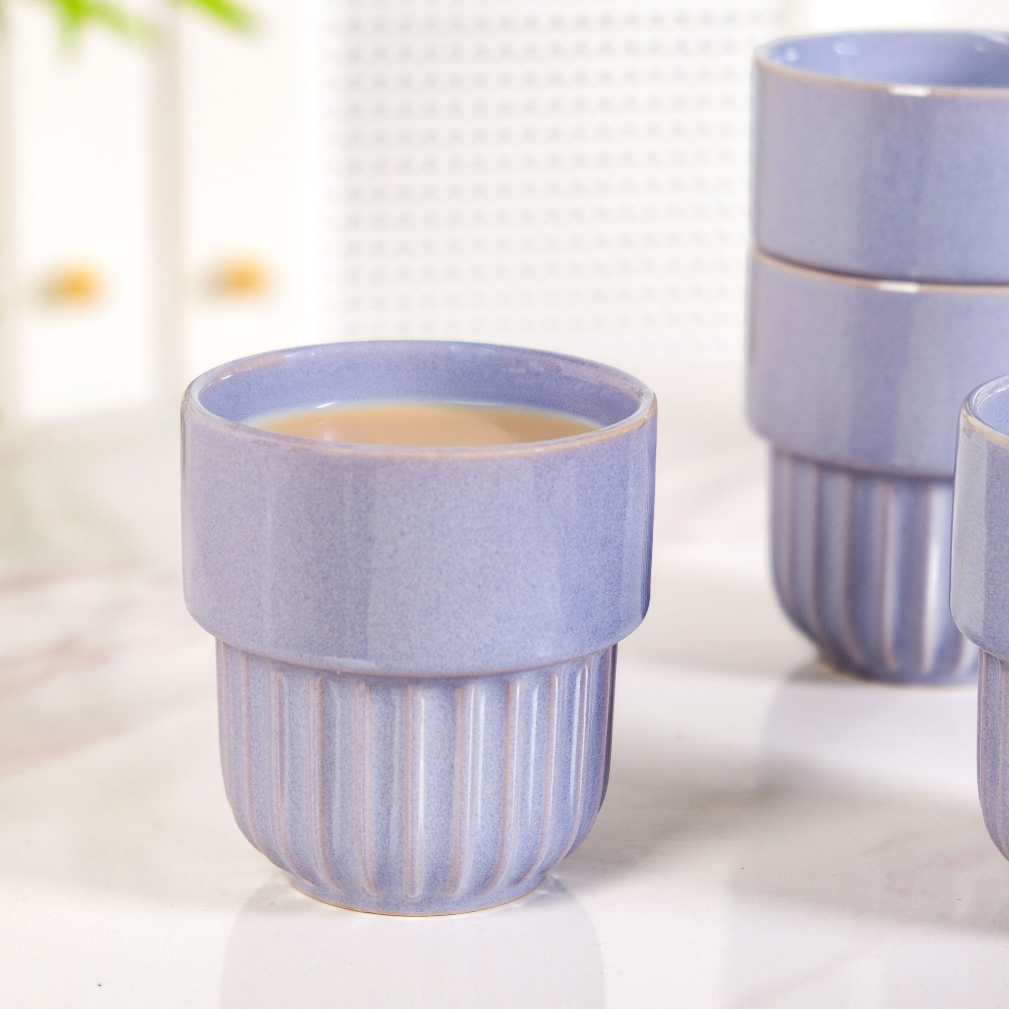 Design: Each cup in this collection is a masterpiece of form and function. It begins with a smoothly rounded top, gently transitioning to a distinct, vertically ribbed fluted design that encircles its lower half. This textured detailing provides a delightful tactile experience. The entire surface is bathed in a lustrous, glossy finish, beautifully enhancing the sophisticated and contemporary lilac-grey hue. What sets these cups apart is their unique stackable design, allowing each cup to nest perfectly within the other, making them an ideal solution for compact spaces.