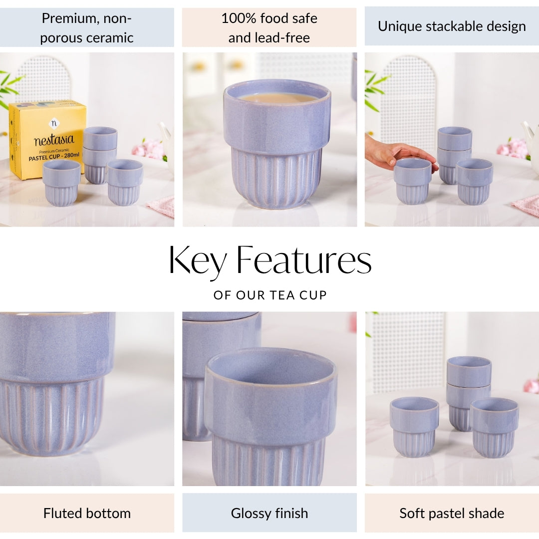 Benefits: These cups offer exceptional durability and a pure, unadulterated taste, as their smooth surface steadfastly resists absorbing flavours or odours. The dazzling glossy finish not only adds a touch of luxury but also ensures effortless cleaning, maintaining their pristine appearance with minimal effort. Their unique stackable design is a boon for any home, freeing up valuable cabinet space and ensuring a tidy environment. Whether you're enjoying a rich espresso, a creamy cappuccino, or a robust masala chai, these cups serve as both practical ceramic tea cups and stylish coffee tumblers, adding an aesthetic delight to any beverage.