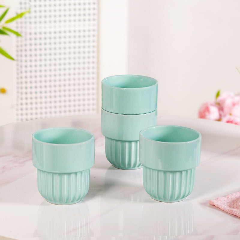 Benefits: Forged from non-porous ceramic, these cups promise steadfast durability and a pristine taste experience, as their smooth surface resists absorbing disparate flavours or odour. The radiant, glossy finish not only makes them a pleasure to handle but also remarkably simple to clean. The unique stackable feature is a true boon for efficient organisation, making them indispensable for compact pantries. The calming mint blue shade, complemented by the elegant ribbed fluting, imparts a fresh, contemporary charm perfect for serving morning coffee, evening tea, or even miniature desserts.