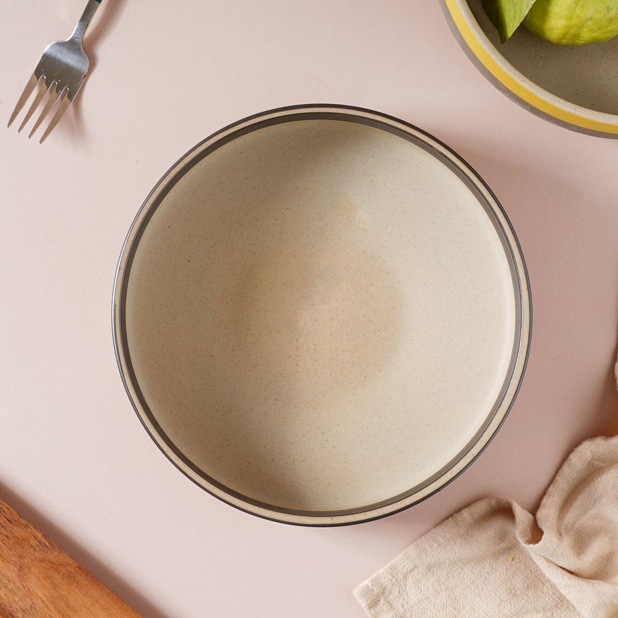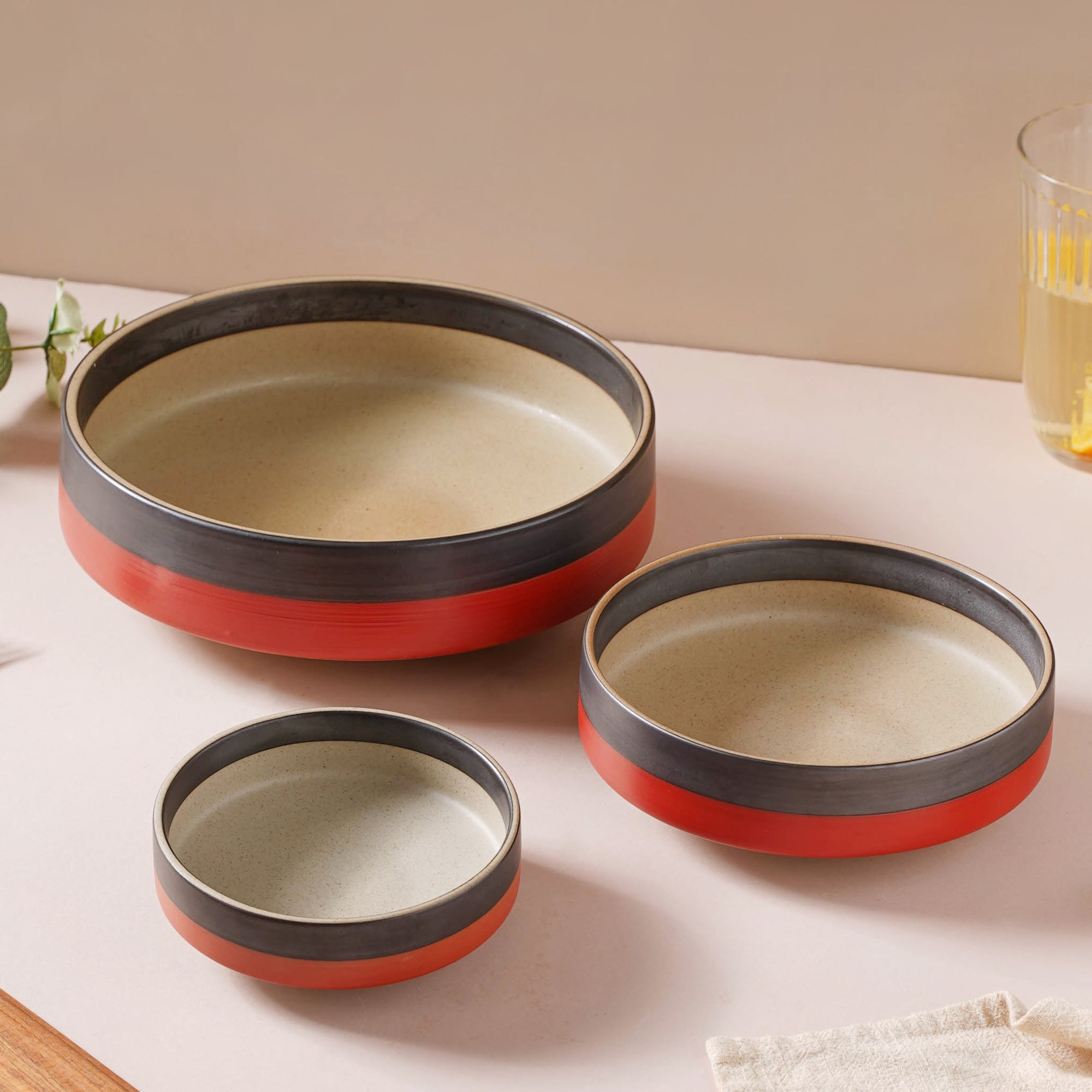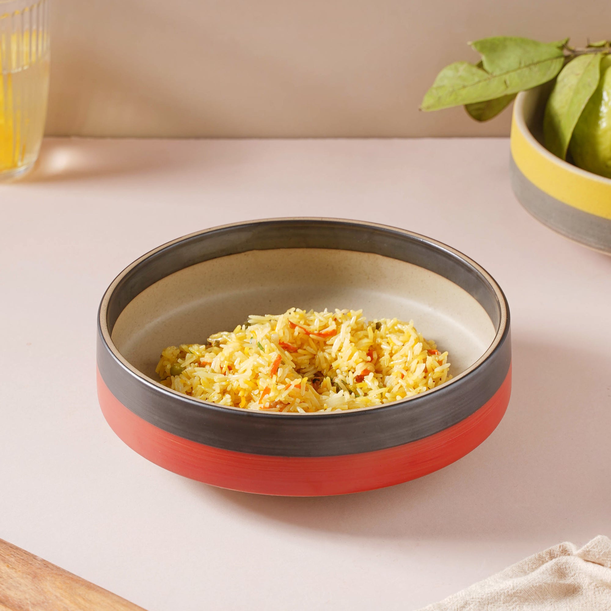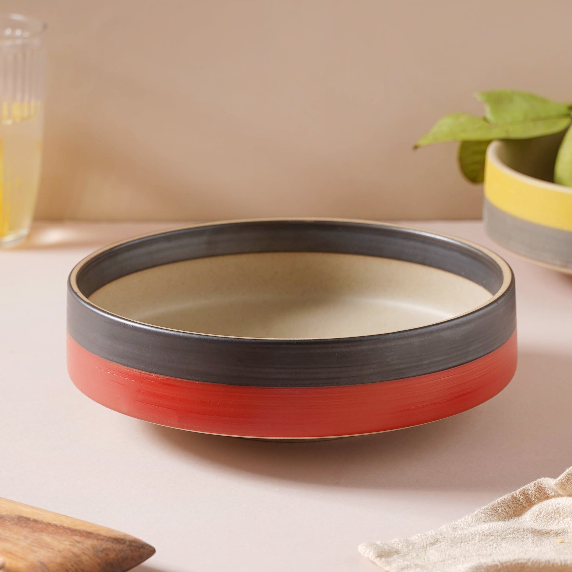 Uplift the cottagecore aesthetics of the interior by serving an array of cuisines in the red and black ceramic earthenware bowl. Adorned with two circular bands of bright hues against the subtle beige base, the clay ceramic bowl is one-of-a-kind. From formal dinners to a casual house party with friends, the versatile serving bowl can be used to serve fruit salads, noodles, and soups of one's choice.