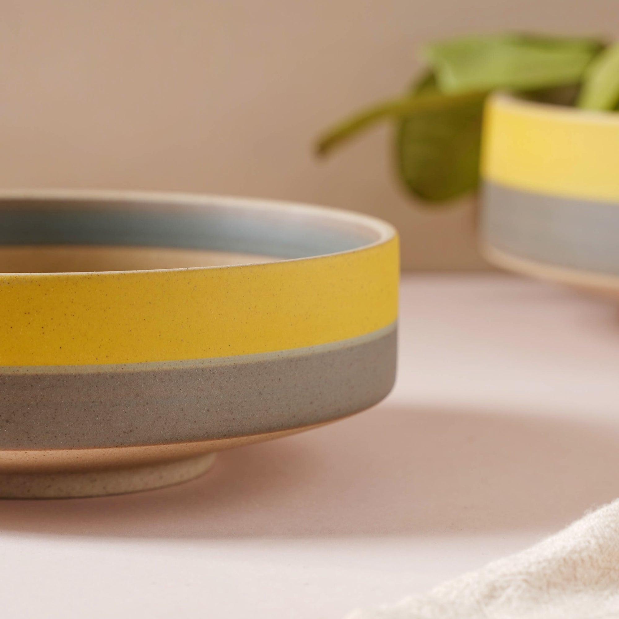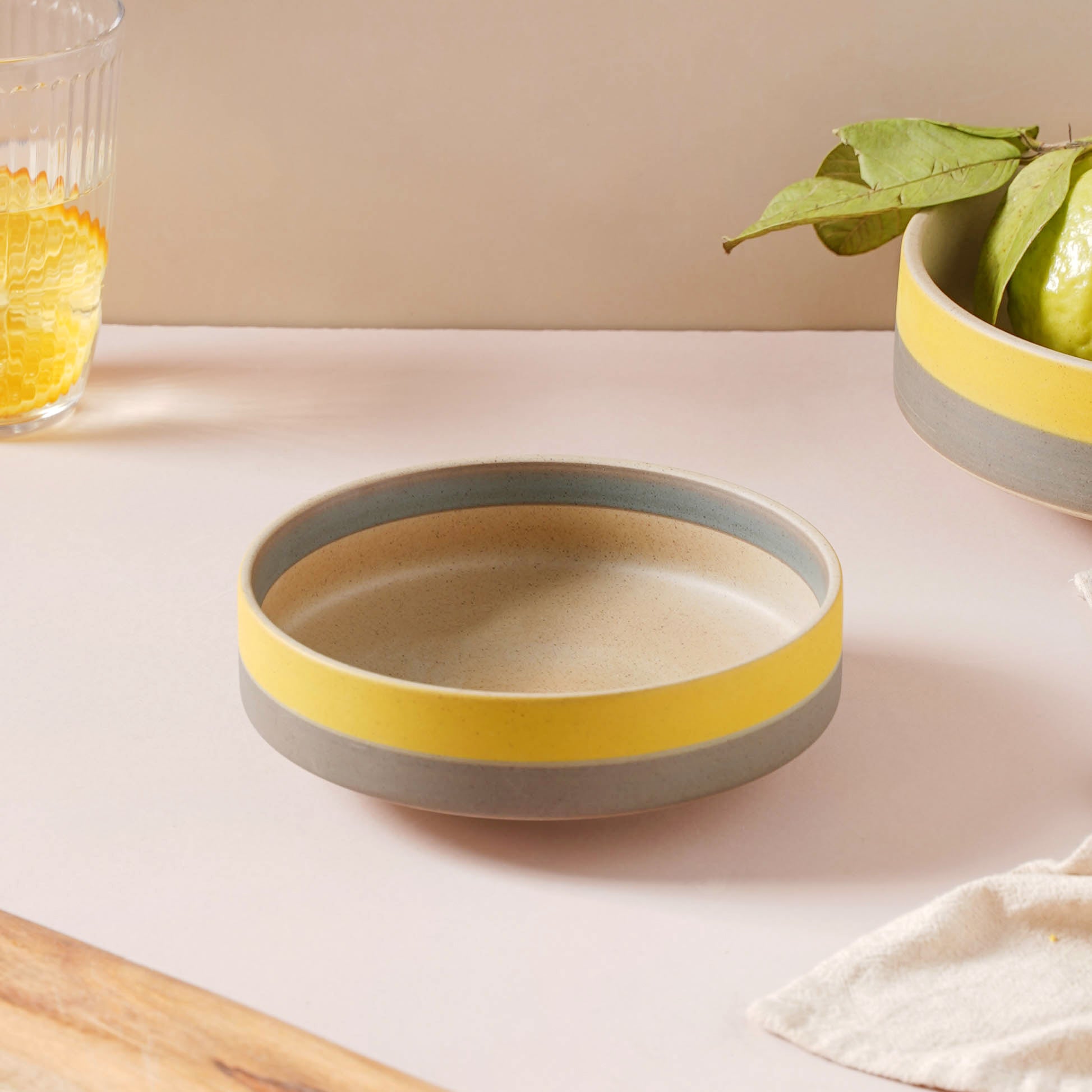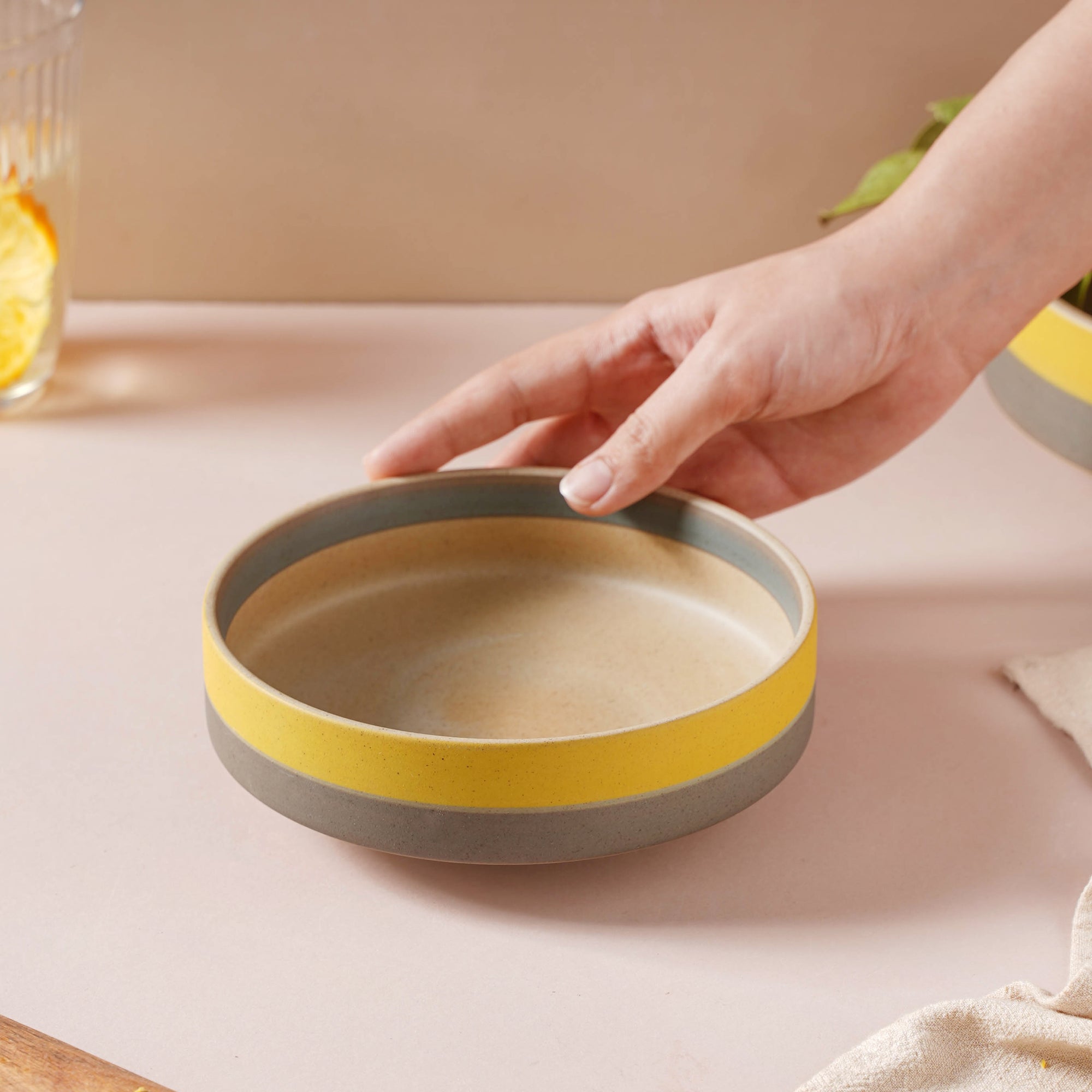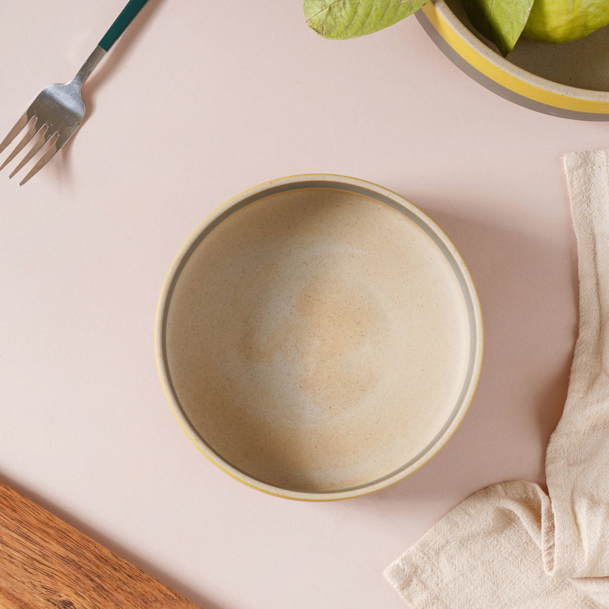 The beige snack bowl with a yellow and grey outer surface will lend a classy appeal to the table. Available in two variant sizes and three different sizes, one can make a complete dinner set or snack set with the earthenware crockery. The snack bowl may be used to serve salad, appetizers, or any other savory items to guests.