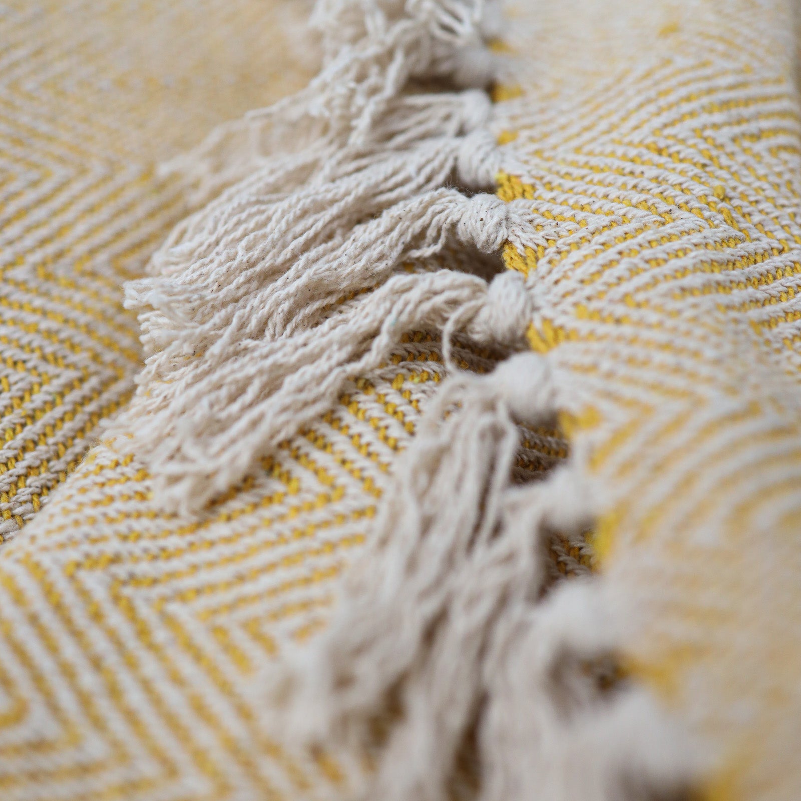 The cozy-soft farmhouse throw is made up of 100% handspun natural cotton. The throw blankets make great gifts for anniversaries, weddings, housewarmings, Christmas, and many more special occasions. The authentic and luxurious throw is completely hand-loomed with a beautiful zig-zag pattern in mustard yellow and cream. Snuggle and enjoy the warmth of the beautiful throw blanket in the bedroom or on the couch while watching a favorite movie and binging on the favorite snack. Organic cotton makes the throw the perfect item for the home. Add natural warmness and freshness to the living area with the tasseled throws.