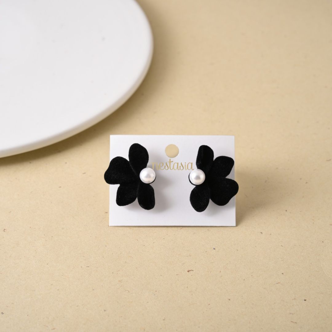 The half flower velvet studs exude a timeless elegance, featuring a soft velvet texture that forms delicate petals. At the heart of the flower sits a stunning faux pearl, adding a touch of classic sophistication. The unique design blends the richness of velvet with the refined allure of the pearl, creating a perfect accessory for both casual and formal occasions.