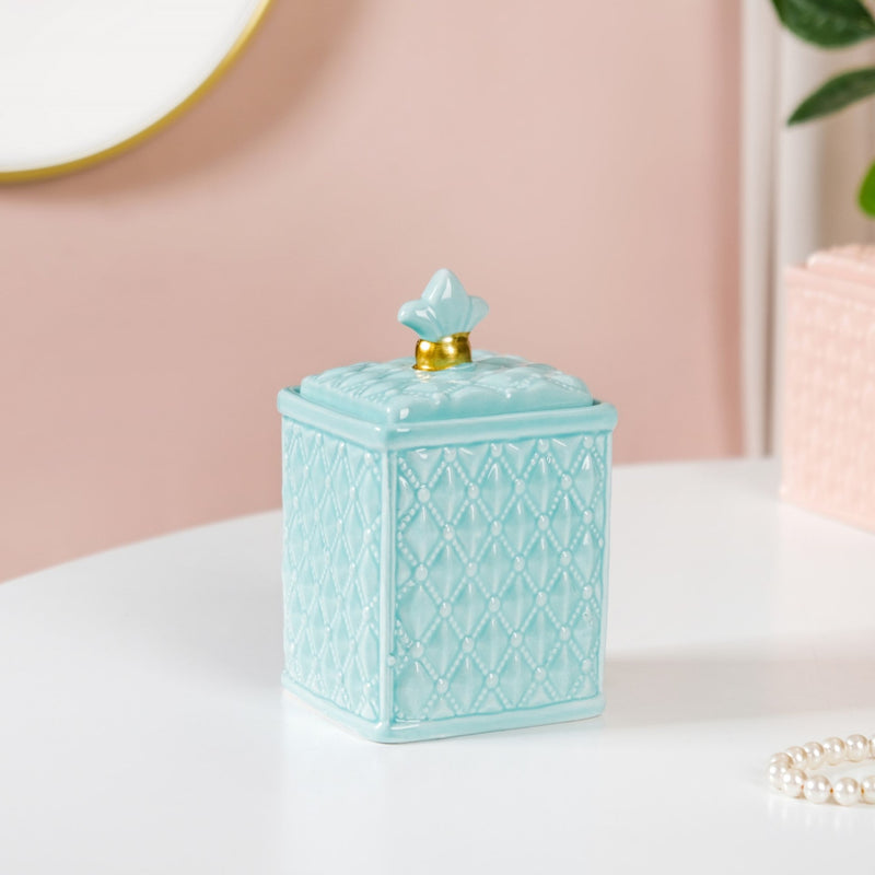 Embrace the art of organization with our stylish and contemporary kitchen jar, a fusion of classic beauty and practicality. Crafted from food-safe ceramic in a subtle green shade, this storage jar boasts intricate diamond patterns on both the exterior and lid. The lid features a petal-shaped knob adorned with a brilliant golden accent, adding a touch of glamour to your home. Perfect for storing dry fruits, spices, tea leaves, coffee beans, and more, this jar is microwave and dishwasher-safe without its lid.