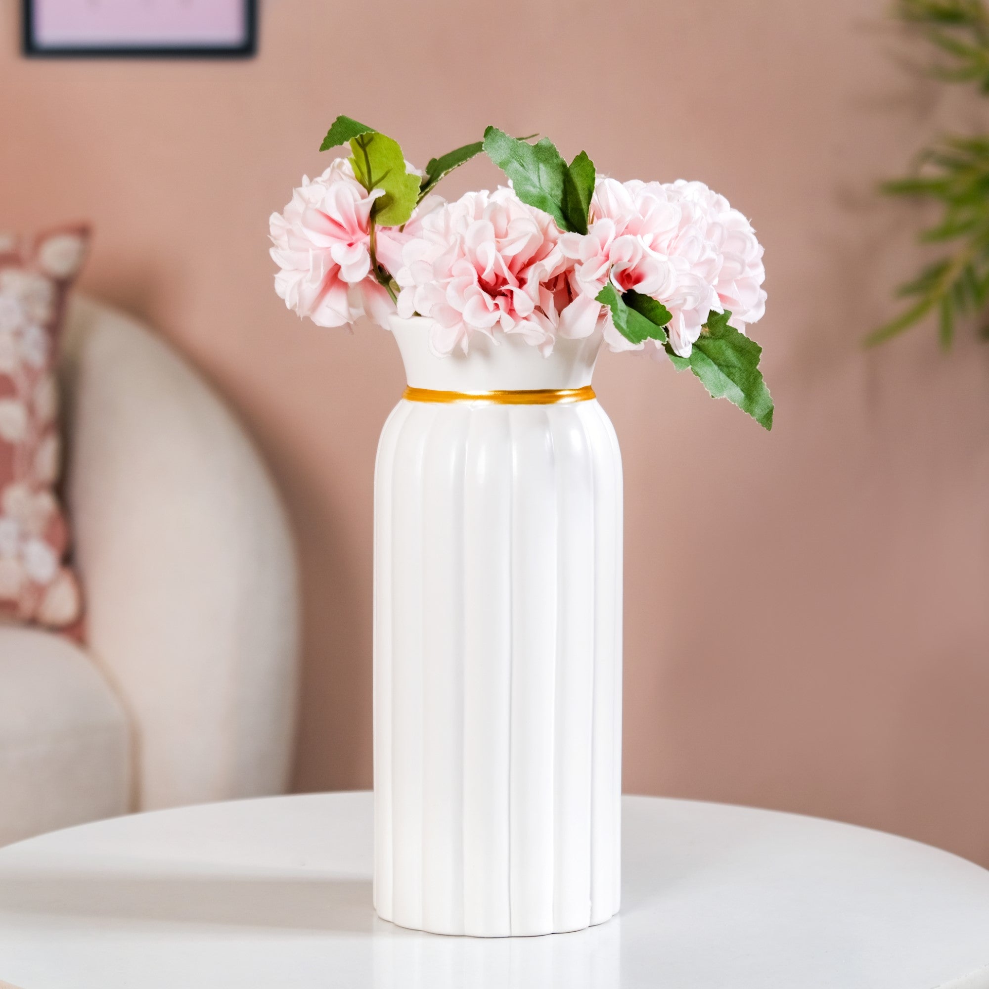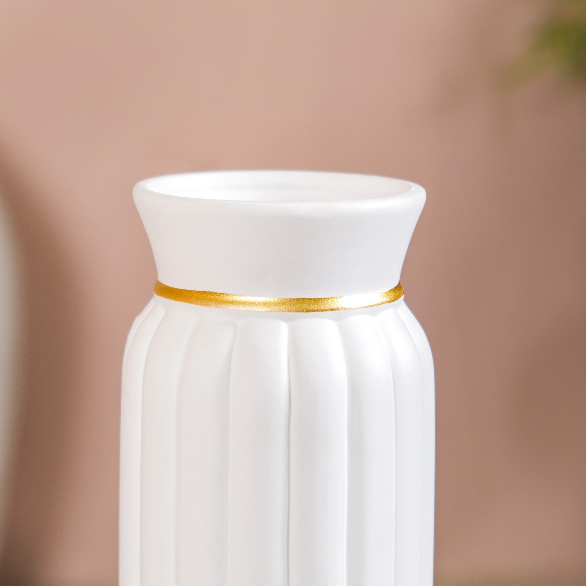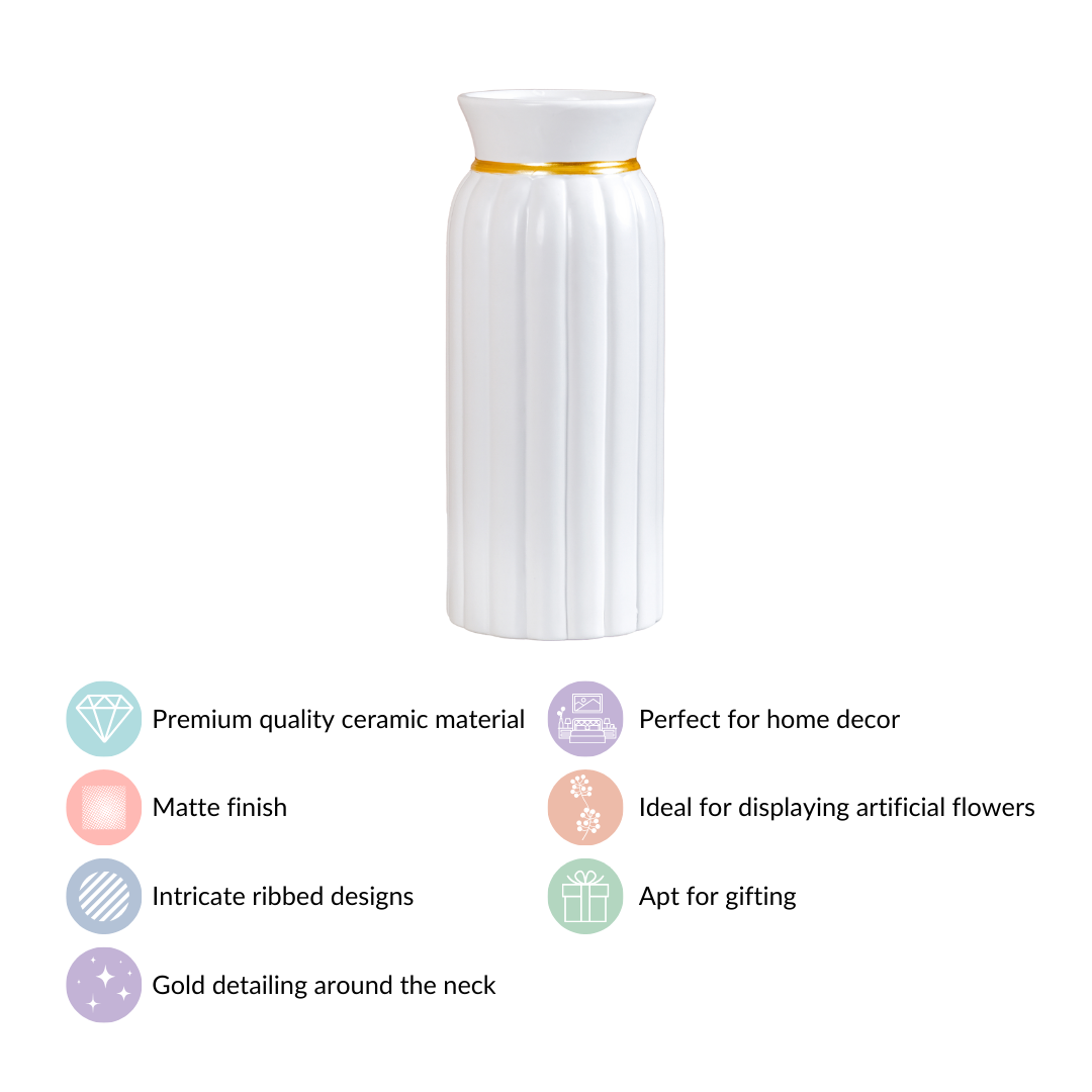 Elevate your home decor with our stunning tall ceramic flower vase, elegantly designed in a pure white shade. Crafted with meticulous precision from high-quality ceramic, the vase boasts intricate ribbed textures on its exterior. The addition of timeless golden detailing around its neck adds a touch of sophistication. This vase's graceful design seamlessly complements a variety of interior styles, offering a versatile and charming display for both artificial and dried flowers.