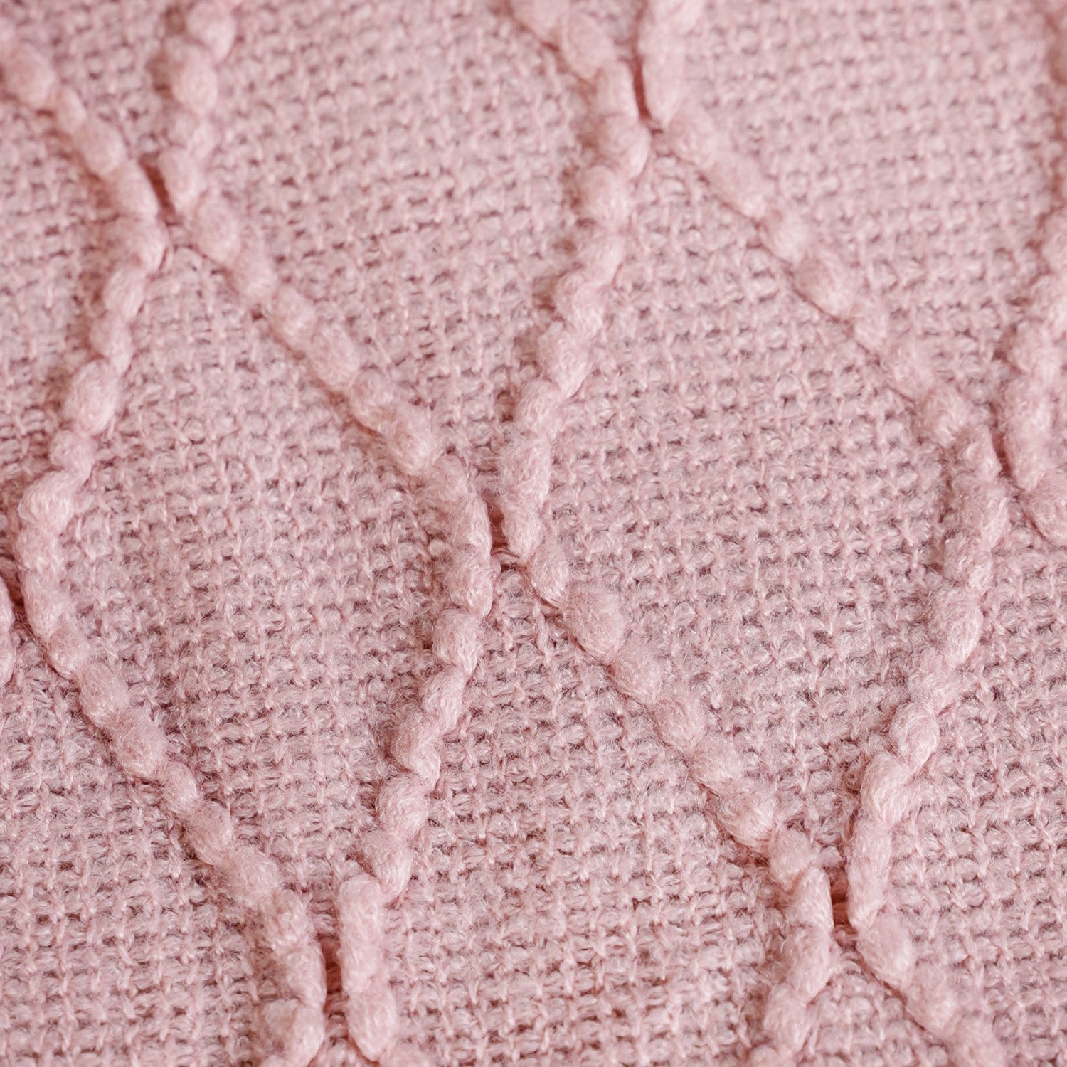 Design: Woven from light, durable acrylic yarn, this throw has a delicate baby pink colour. The surface is adorned with a charming quilted diamond pattern created by raised, small bobbles, giving the fabric a rich, textured feel. It is beautifully finished with flowing fringes along the edges for an artisanal look.