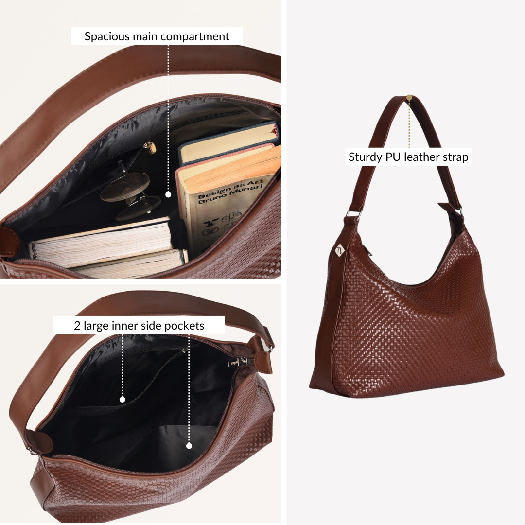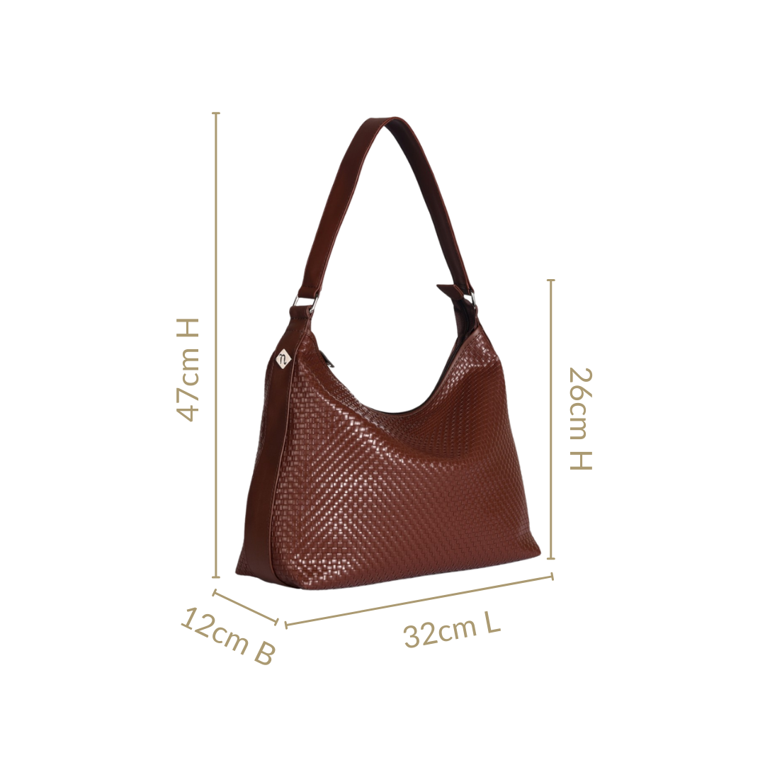 Design: Crafted from high-quality brown PU leather, this handbag features a subtle basket weave pattern. Inside, you'll find two spacious pockets—one with a zip closure and the other open for quick access. The bag is finished with a discreet side logo, a durable thick strap for comfort, and a sturdy metal zipper for added functionality.