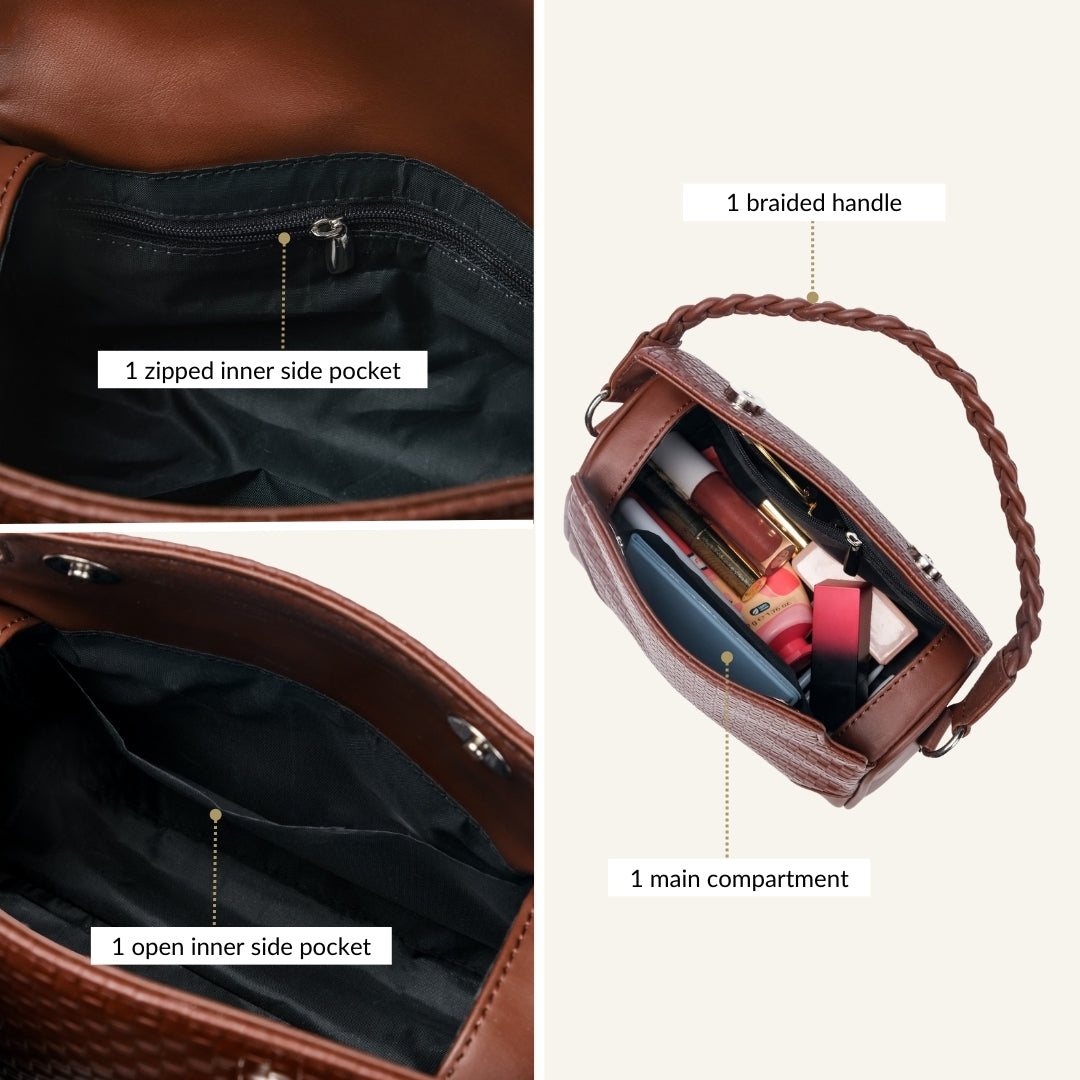 Design: The warm brown shade perfectly enhances the handbag’s pattern, giving it a refined yet relaxed appeal. The top flap closes securely with two magnetic buttons, keeping your belongings safe while adding to the sleek design. The roomy main compartment ensures you have space for all your essentials, while the open inner pocket is great for easy-access items. The zipped inner pocket keeps your valuables secure. Finished with a sturdy braided handle and durable metal hardware, this handbag is as reliable as it is stylish.