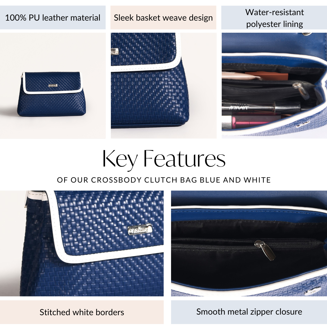 Design: This elegant clutch purse features a sleek basket weave design, complemented by stitched white borders for a clean and refined look. The smooth metal zipper closure ensures easy access while keeping your essentials secure. Inside, you'll find a zippered middle pocket and two inner open compartments for organized storage. A detachable sling strap adds versatility, allowing you to wear it as a crossbody sling bag or carry it as a clutch.