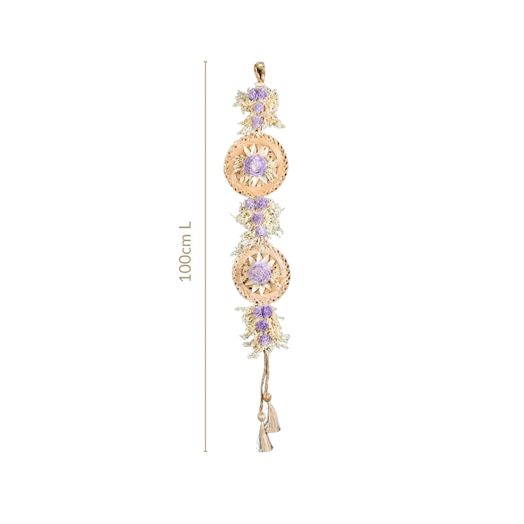 Design: The aesthetic of this wall art set is a celebration of organic texture and subtle color. It features a vertical cascade of woven jute bases, each one meticulously crafted to hold a large, captivating lavender sola pith flower. These central blossoms are complemented by delicate sprigs of dried grasses and smaller sola pith blossoms, which gracefully connect each woven section. The piece is finished with charming jute tassels at the end for an added touch of rustic elegance. The pieces are constructed from natural materials, offering a beautiful design that brings the outdoors in.