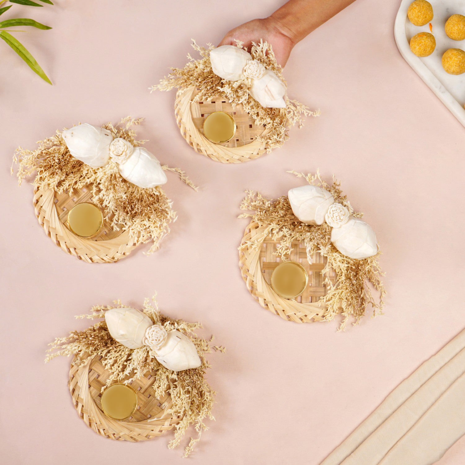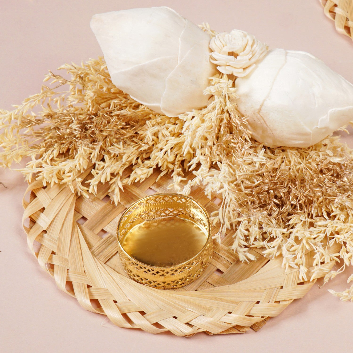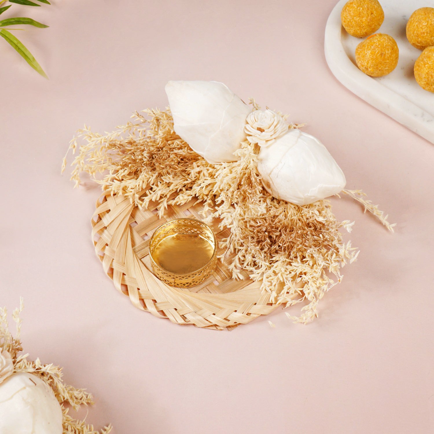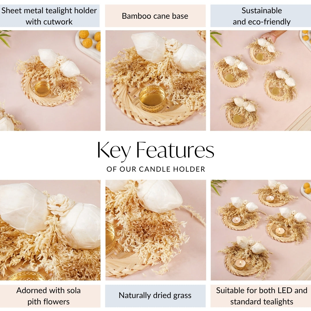 Design: Turn every celebration into a mindful affair with our all-natural tea light holder. A blend of natural craftsmanship and earthy elegance, this set is handcrafted using biodegradable materials to create a serene, rustic glow. Featuring delicate dried florals, sola blooms, and a palm-woven design base, each holder evokes a soft, grounded aesthetic. The cream-white palette exudes purity, while the intricate floral arrangement and woven base highlight the craftsmanship behind each piece. The large sola lotus paired with airy dried grass adds a sense of organic grandeur, making the design equally minimal and luxurious.