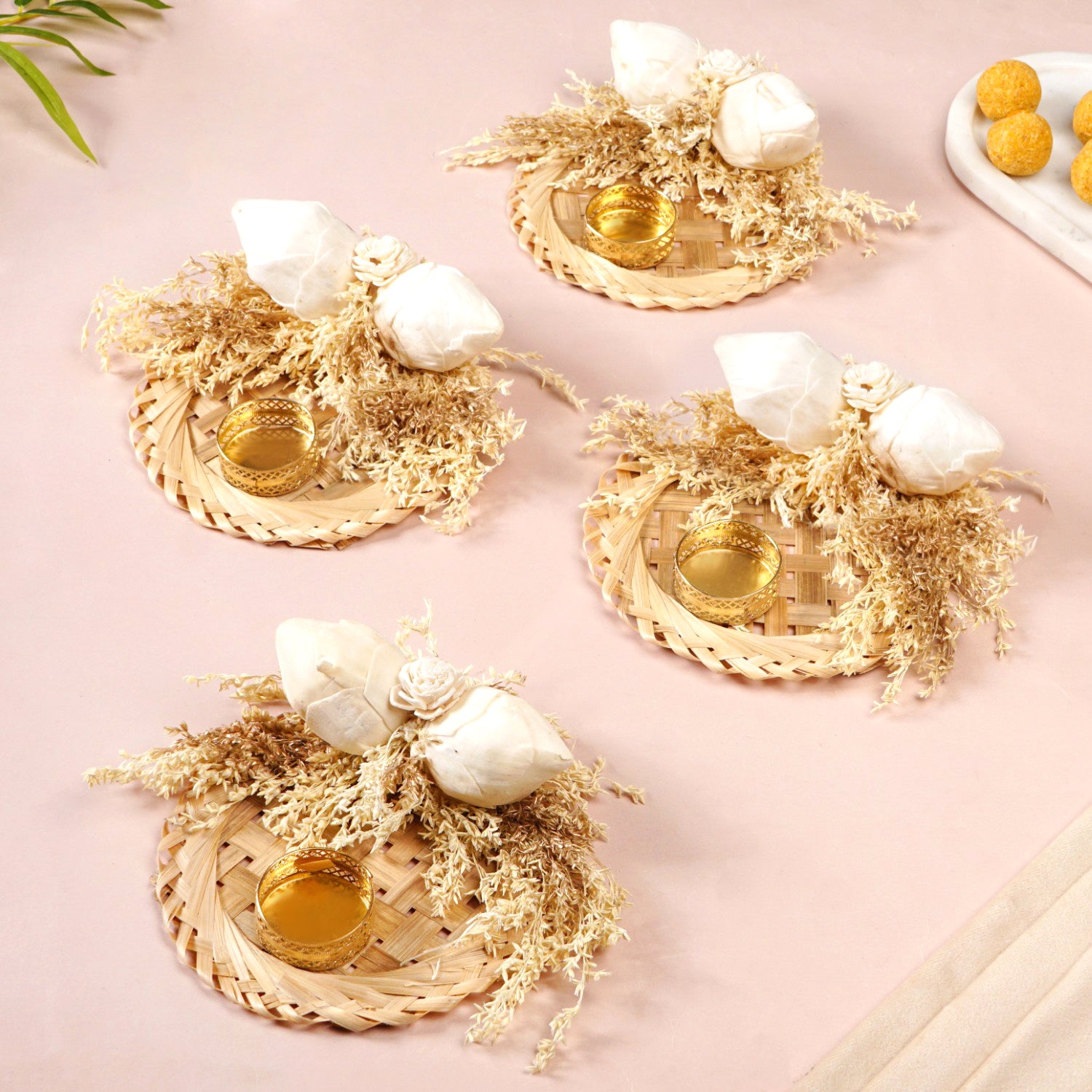 Benefit: These tea light holders are lightweight, reusable, and crafted entirely from organic, biodegradable, and plastic-free materials, perfect for eco-conscious décor lovers. The golden insert securely holds both standard and LED tealights, ensuring safe and stable use. Ideal for poojas, festive dinners, weddings, or housewarmings, the set brings earthy yet refined charm to any celebration. Each handcrafted piece is unique, offering a truly artisanal, sustainable touch that reflects mindful and planet-friendly living.