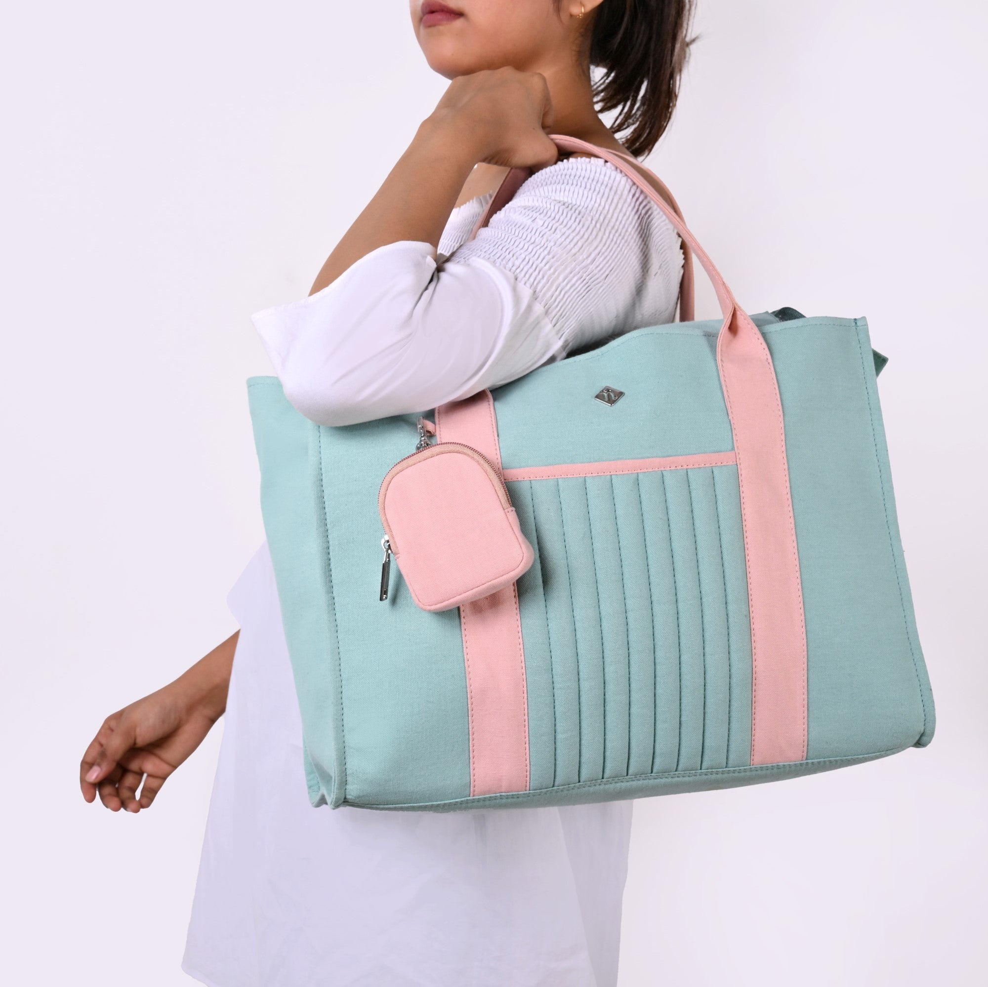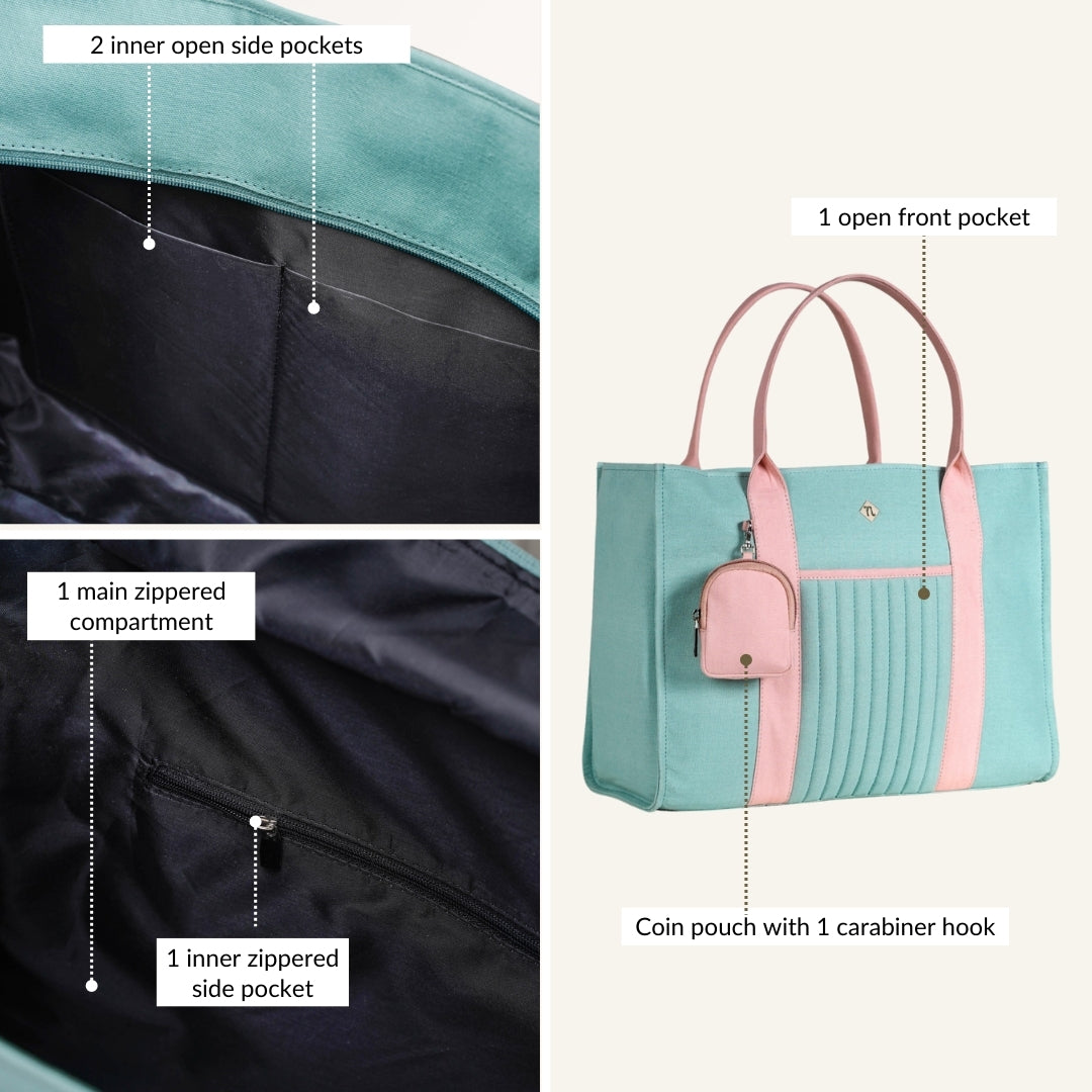Design: The Sorella tote features a refreshing mint green canvas cotton exterior, complemented by sturdy pink handles for a delightful contrast. Its structured silhouette includes a main zippered compartment, an open front pocket, and multiple inner pockets - two open side pockets and one zippered side pocket - offering ample storage. A matching pink zippered coin pouch with a carabiner hook adds both functionality and style.