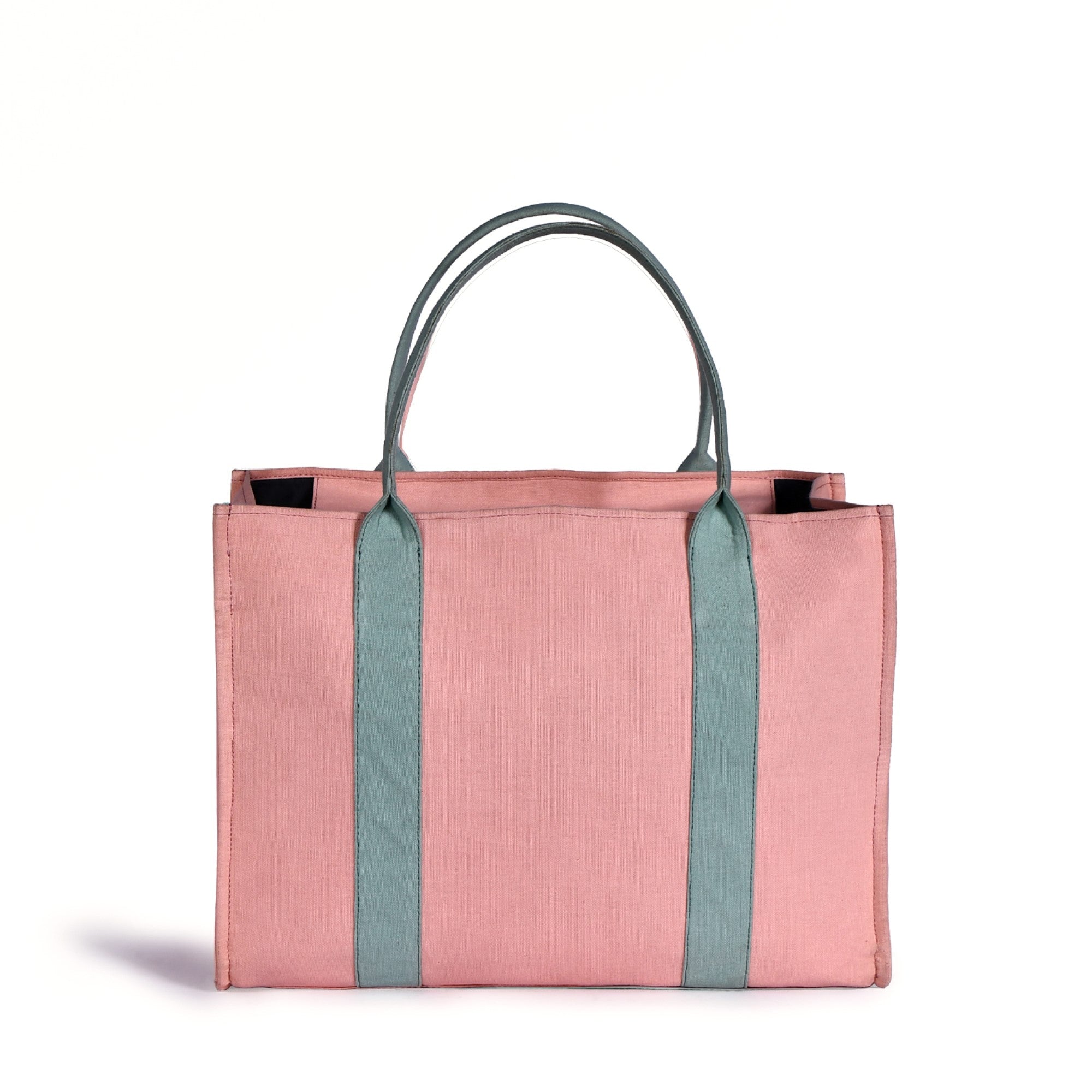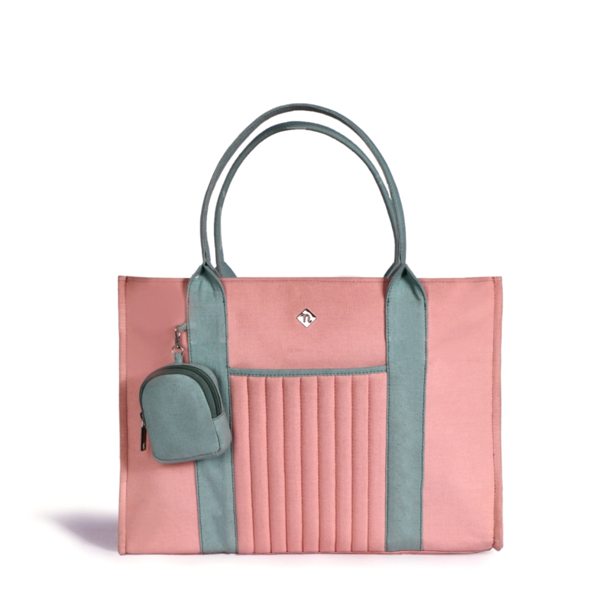 Design: The Sorella tote features a soft pink canvas cotton exterior paired with sturdy mint green handles for a refreshing contrast. It includes a main zippered compartment, an open front pocket, two inner open side pockets, and an inner zippered side pocket to keep belongings organised. A matching zippered mint green coin pouch with a carabiner hook adds extra convenience.