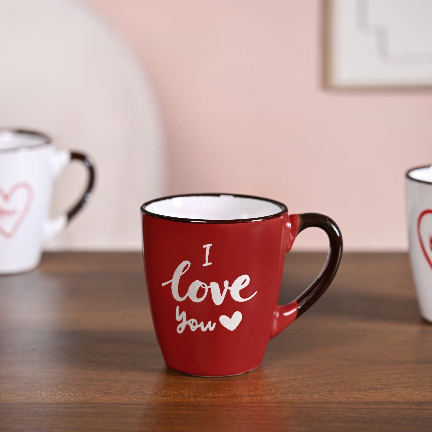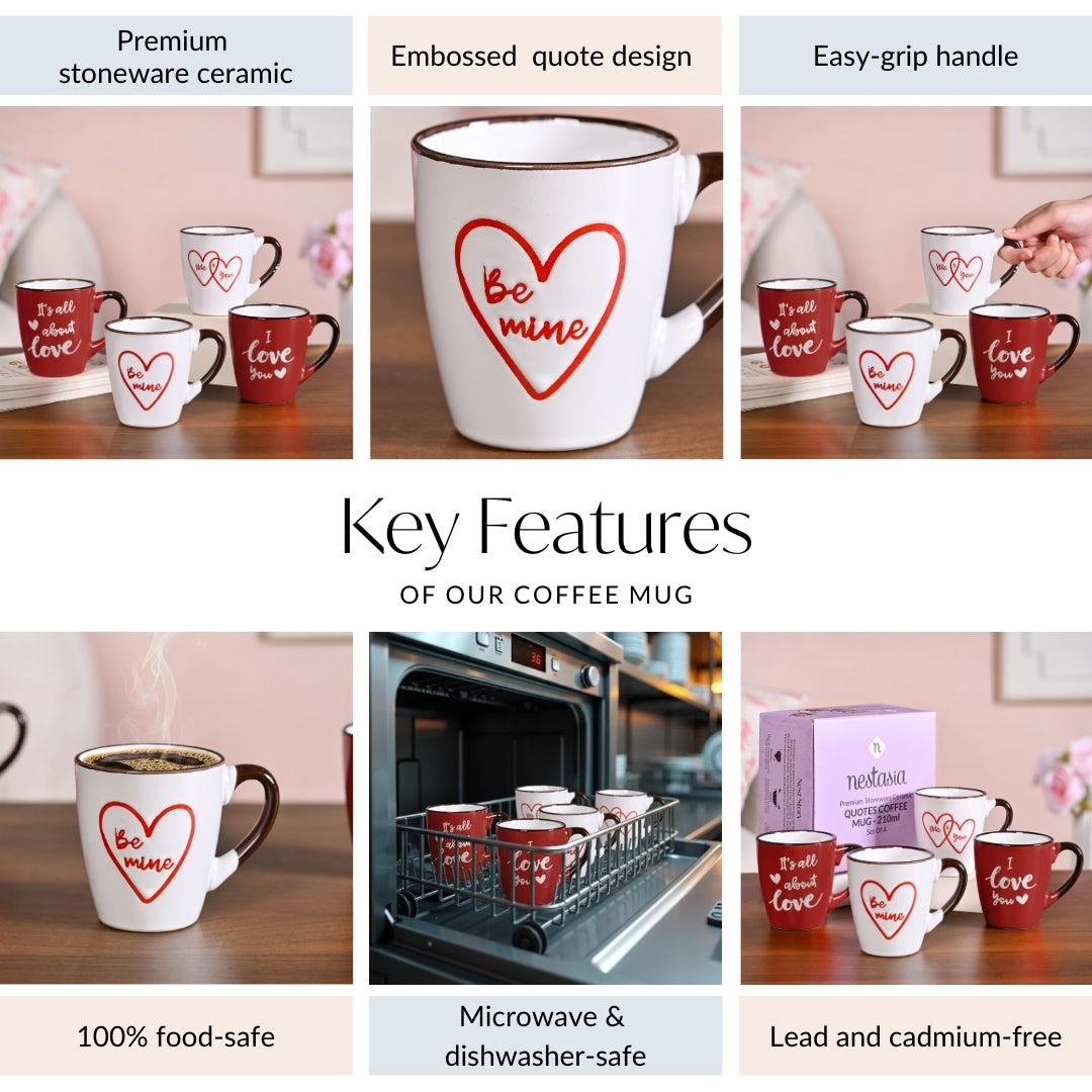 Design: Celebrate love in every sip with this adorable set of four ceramic mugs. Featuring a glossy finish, rich red and white hues, and a deep brown rim, each mug is inscribed with charming love quotes like “Me & You,” “I Love You,” “Be Mine,” and “It’s All About Love,” complete with heart motifs. With sturdy handles, flat bases, and textured bottoms, they blend romantic flair with everyday functionality.