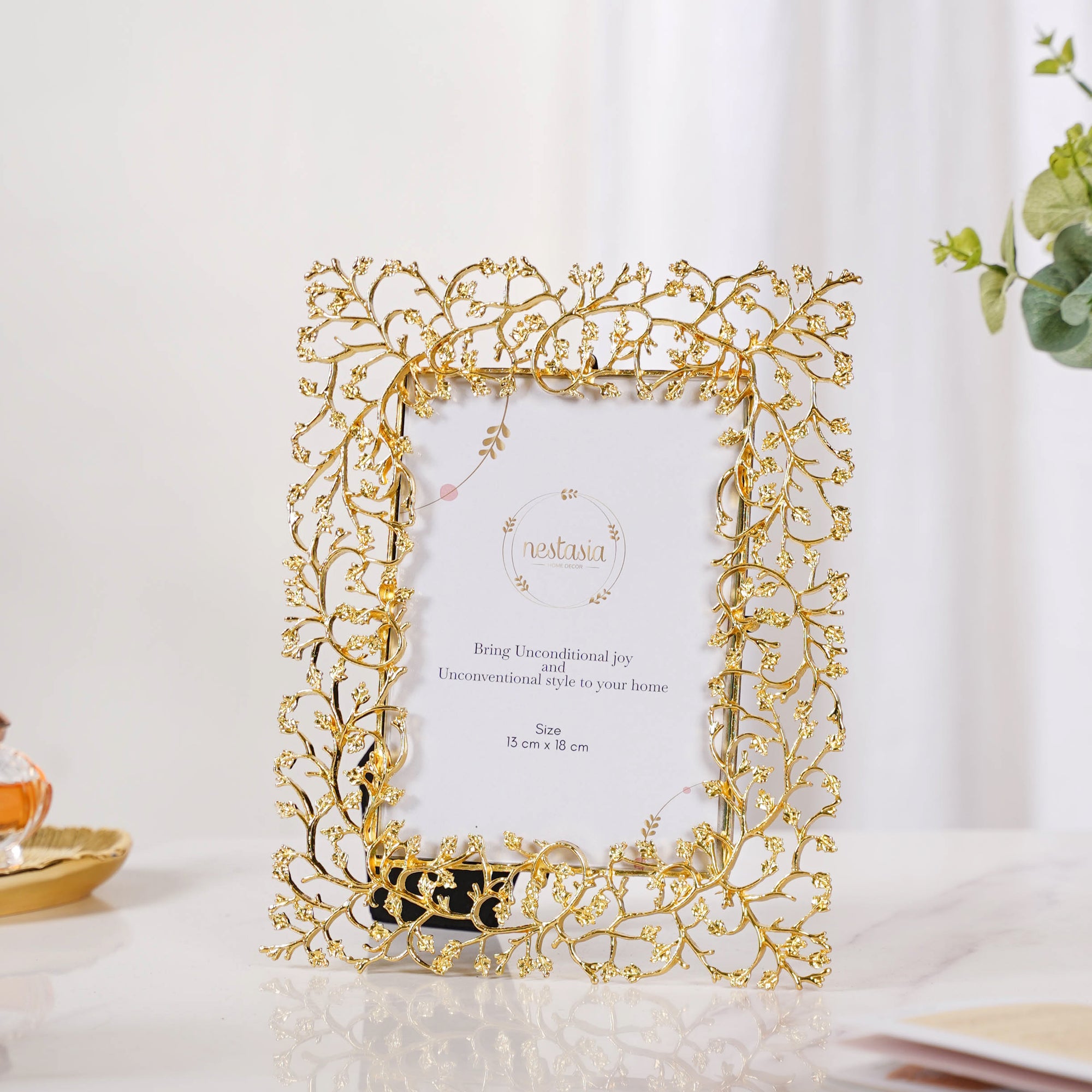 The photo frame has a nature-inspired lattice in glazing gold inlaid on each side, bringing an air of sophistication to formal and regular settings. Mini branches bearing a leaf at the tip are constituents of the lattice.